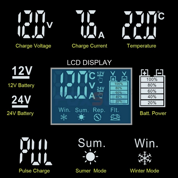 Идеально подходит для кальциевых, гелевых, AGM, аккумуляторов с влажной и сухой регенерацией, а также сульфатных аккумуляторов.