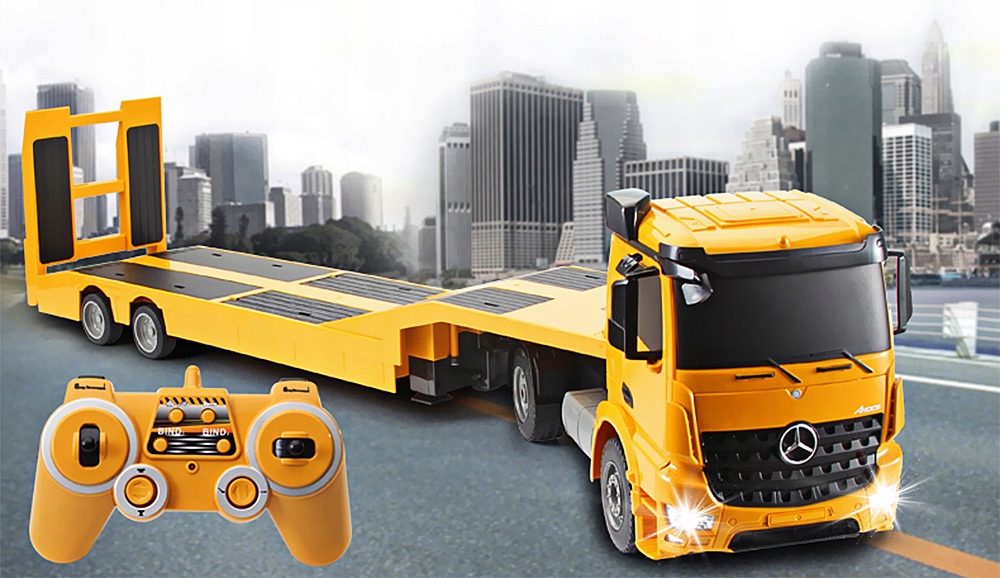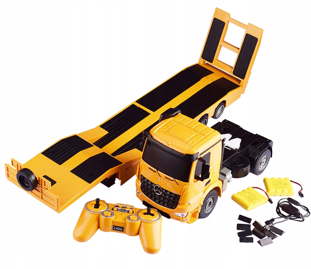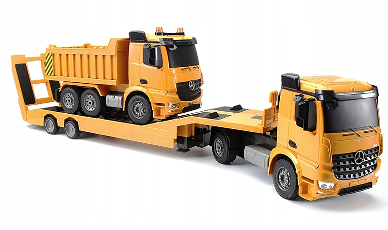 В комплект входит лицензионный тягач Mercedes-Benz с эвакуатором. быть полезным при транспортировке тяжелой строительной техники. Во время работы он издает реалистичные звуки. Благодаря радиопульту 2,4 ГГц обеспечивается полный контроль над трактором и прицепом.