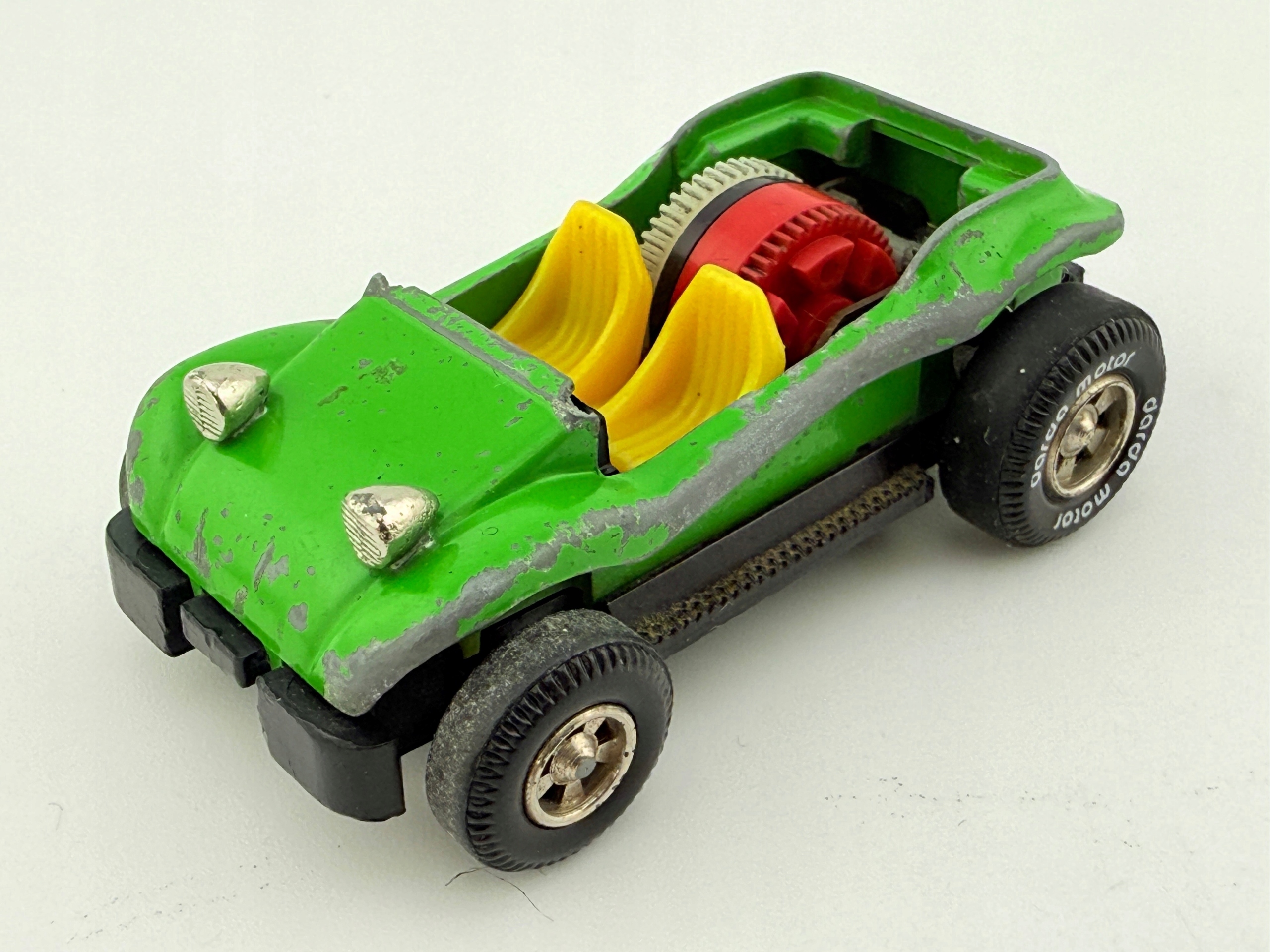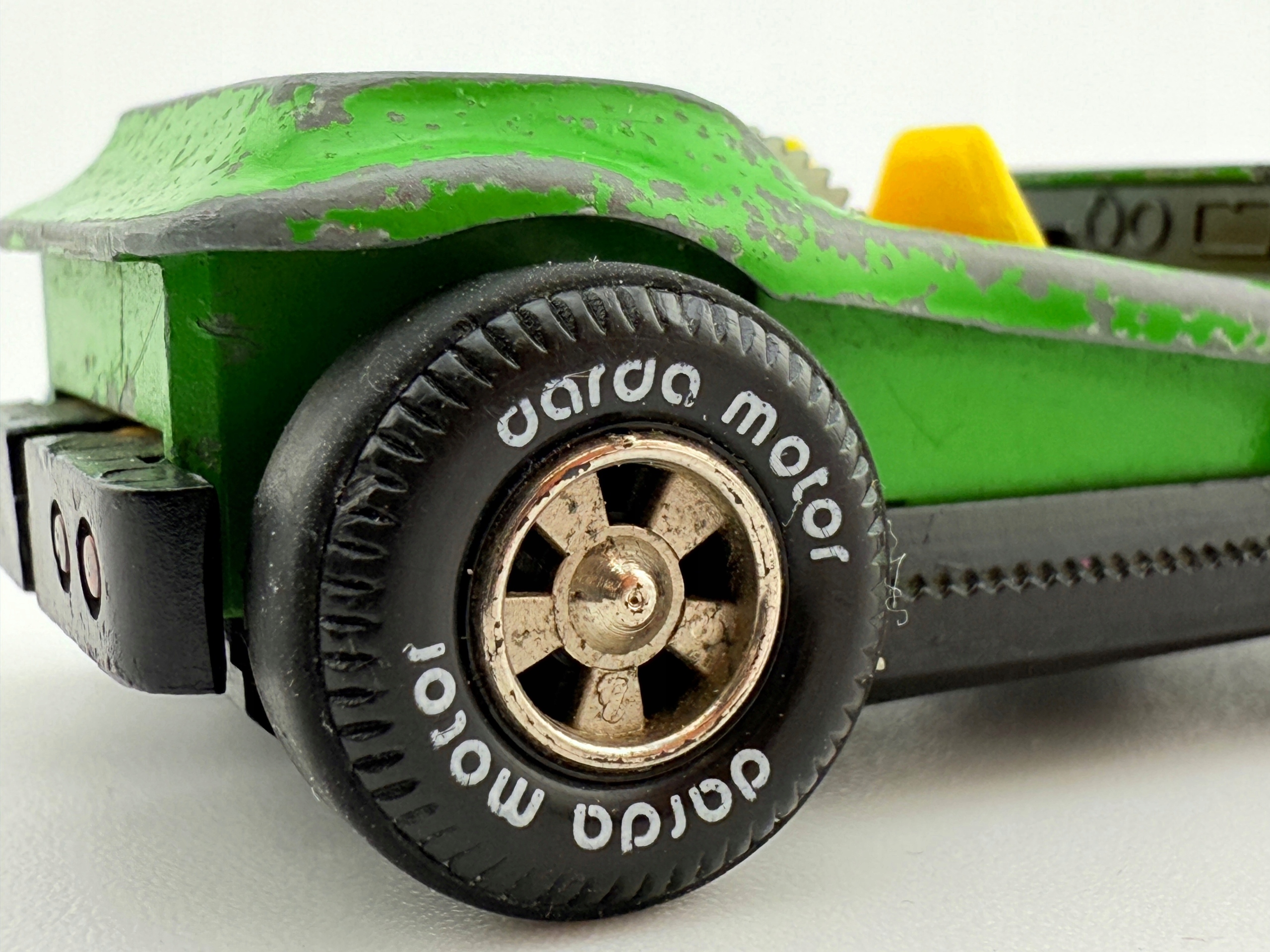 Модель Darda Car — классический весенний автомобиль, привлекающий внимание ярким зеленым цветом и характерными желтыми сиденьями. Эта модель, изготовленная из металла и пластика, имеет отверстие сзади, через которое можно видеть двигатель. Его детали, такие как серебряные фары, добавляют ему очарования. Несмотря на видимые следы использования, пружина выглядит хорошо. Это интересный элемент любой коллекции, особенно для любителей моделей 80-х.