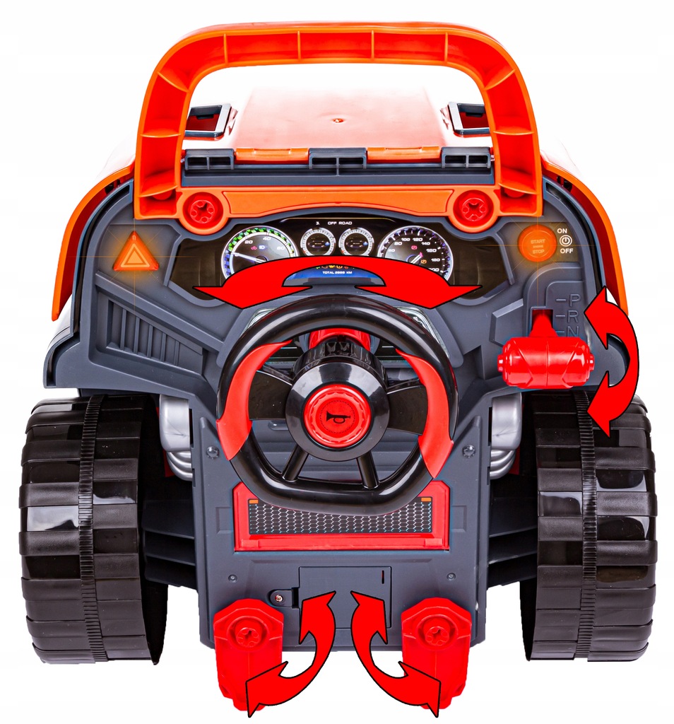Руль поворачивается, как в настоящем грузовике, также имеется рабочий звуковой сигнал. Однако под рулевым колесом имеется практичный отсек для инструментов и мелких аксессуаров.