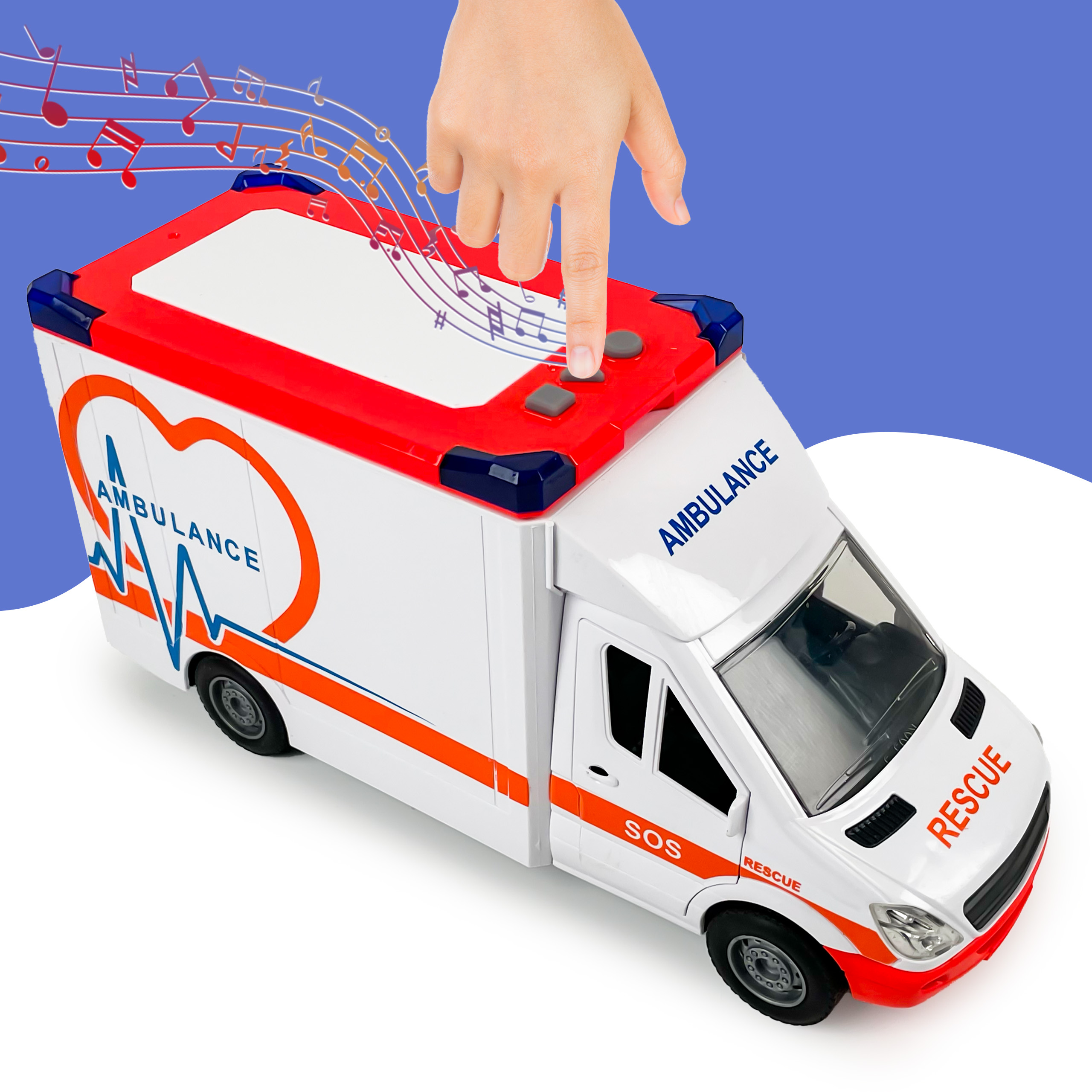 Чтобы запустить веселье, машине скорой помощи не нужны батарейки — просто нажмите на нее, и она поедет! Фрикционный привод делает развлечение более экологичным и бесперебойным благодаря необходимости замены батареек.