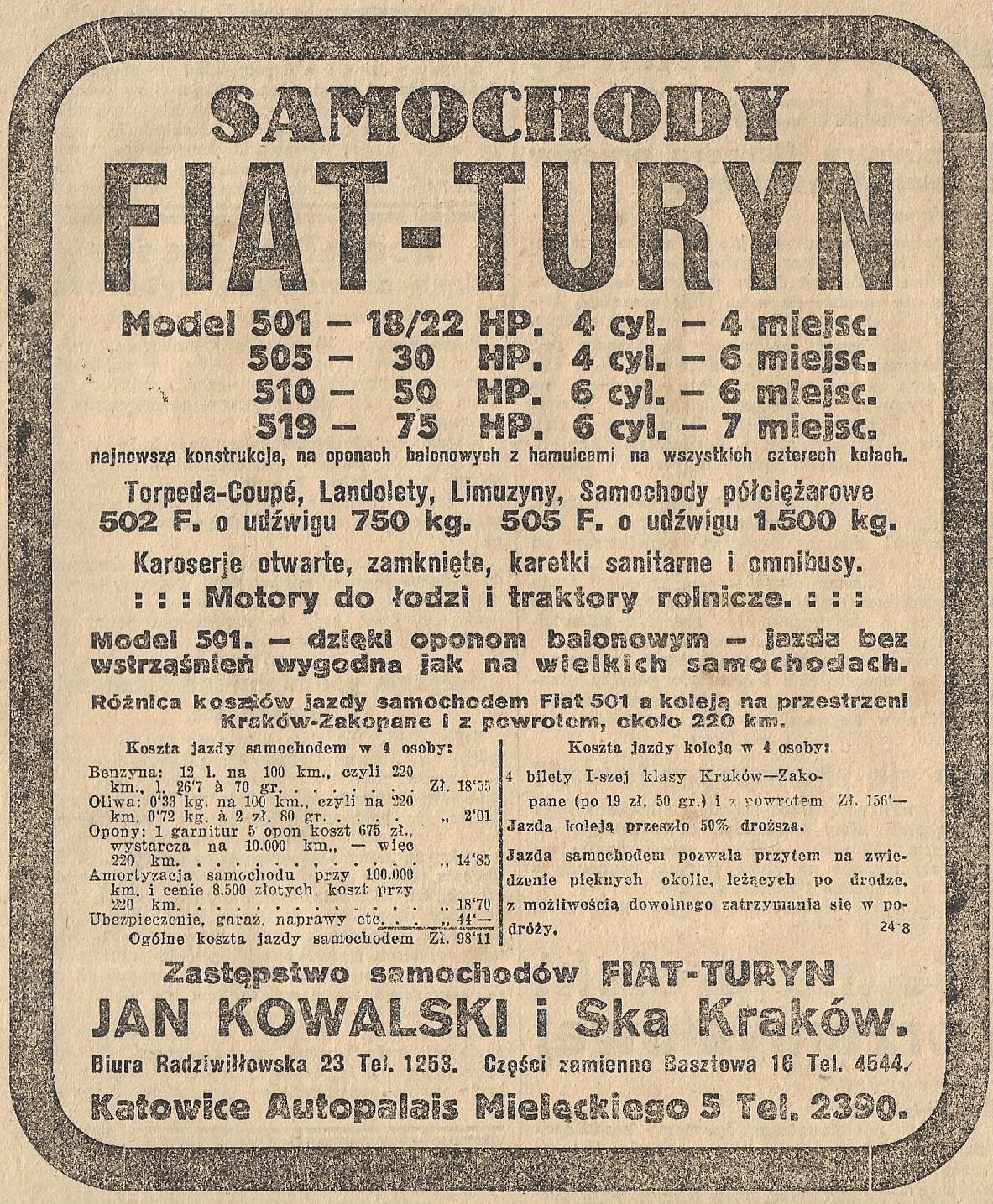 АВТОМОБИЛЬ FIAT 501 505 510 519 - ЖЕЛЕЗНОДОРОЖНАЯ ДОРОГА КРАКОВ ЗАКОПАНЕ PKP