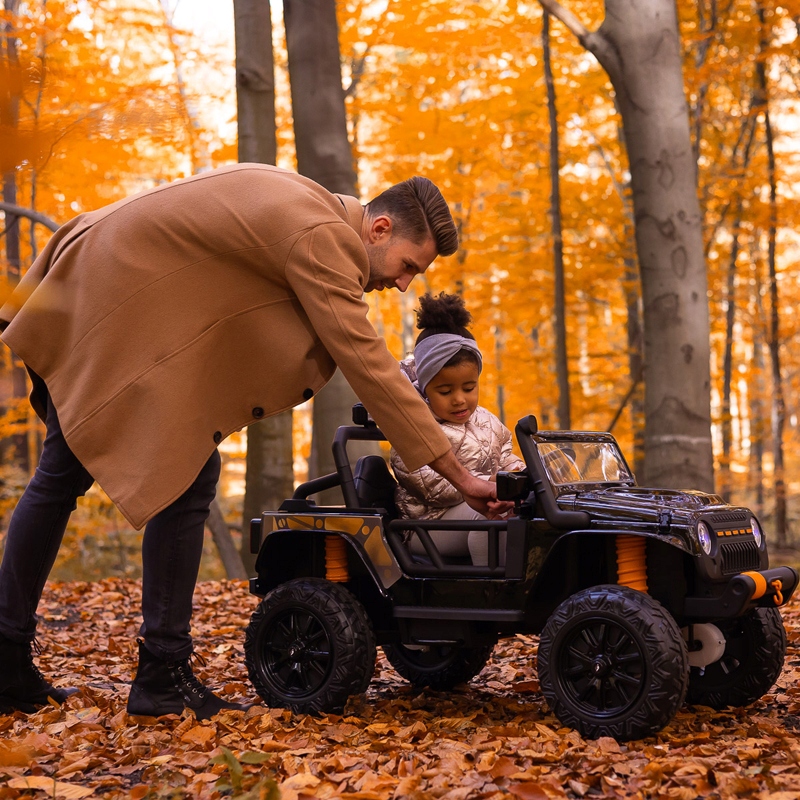 Вождение по бездорожью облегчают 4 мощных двигателя с питанием каждого колеса отдельно, дорожный просвет 18 сантиметров и 30-сантиметровые шины с крупным протектором из пены EVA. Комфорт вождения обеспечивают амортизаторы на задней оси, удобное сиденье, обитое экокожей и музыкальная панель с Bluetooth и USB.