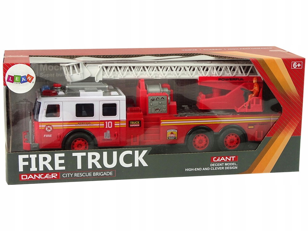 Красная пожарная машина имеет регулируемую лестницу, которую можно перемещать вверх и вниз, а также удлинена и сокращают ее. Кроме того, его можно повернуть во всех направлениях, что позволит получить доступ к большинству мест, а его диапазон максимально на 50 см. В нижней части лестницы есть платформа, которая может быть занята фигуркой пожарной и управляющей ее рулем. Тележка также оснащена световыми и звуковыми эффектами. Передние огни и верхние петухи сияют, что позволяет воспринимать автомобиль издалека. Огонь имеет заднюю ось трения задних оси на толкатель, просто нажмите на спину, выпустите вперед и наслаждайтесь скоростью.
