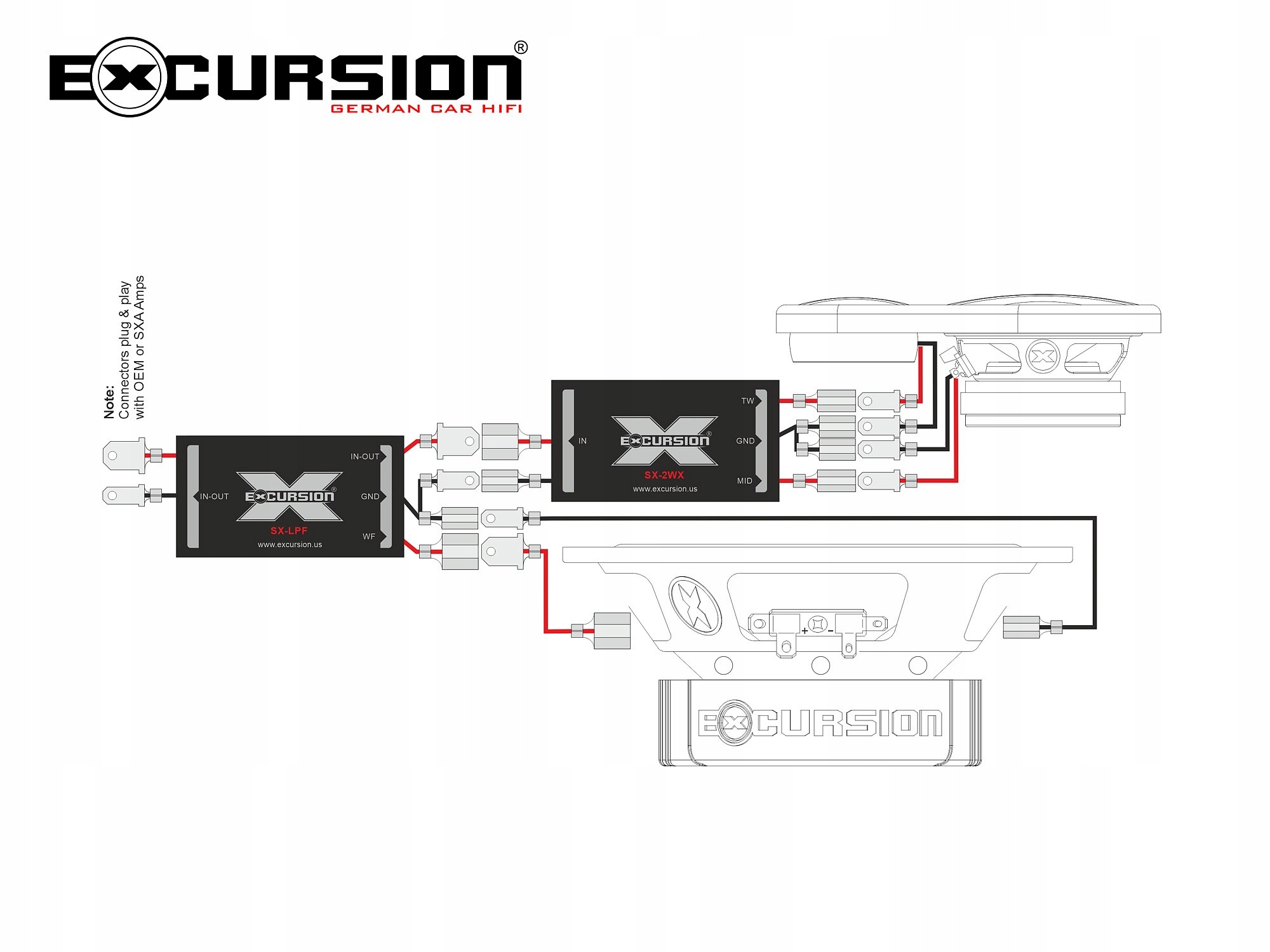 3-полосная автомобильная акустика с низкочастотными динамиками диаметром 130 мм из серии Excursion SX (Street e Xкурсия). В комплект входят 2 низкочастотных динамика, 4 кроссовера Plug&Play и комплект среднечастотных/твитеров SX-SAT (2 высокочастотных динамика + 2 среднечастотных динамика + рамки и монтажные панели). Кроссоверы оснащены высококачественными конденсаторами МКП и обеспечивают широкий выбор конфигураций подключения. Магниты низкочастотных динамиков имеют центральные отверстия для вентиляции и снижения резонансной частоты (FS), а также дальнейшего повышения эффективности системы охлаждения катушек. Диафрагмы НЧ-динамиков оснащены специально разработанными пылезащитными колпачками в стиле фазовых эквалайзеров, задачей которых является улучшение звучания средних тонов при слишком большом угле прослушивания (например, при низком расположении дверных НЧ-динамиков).