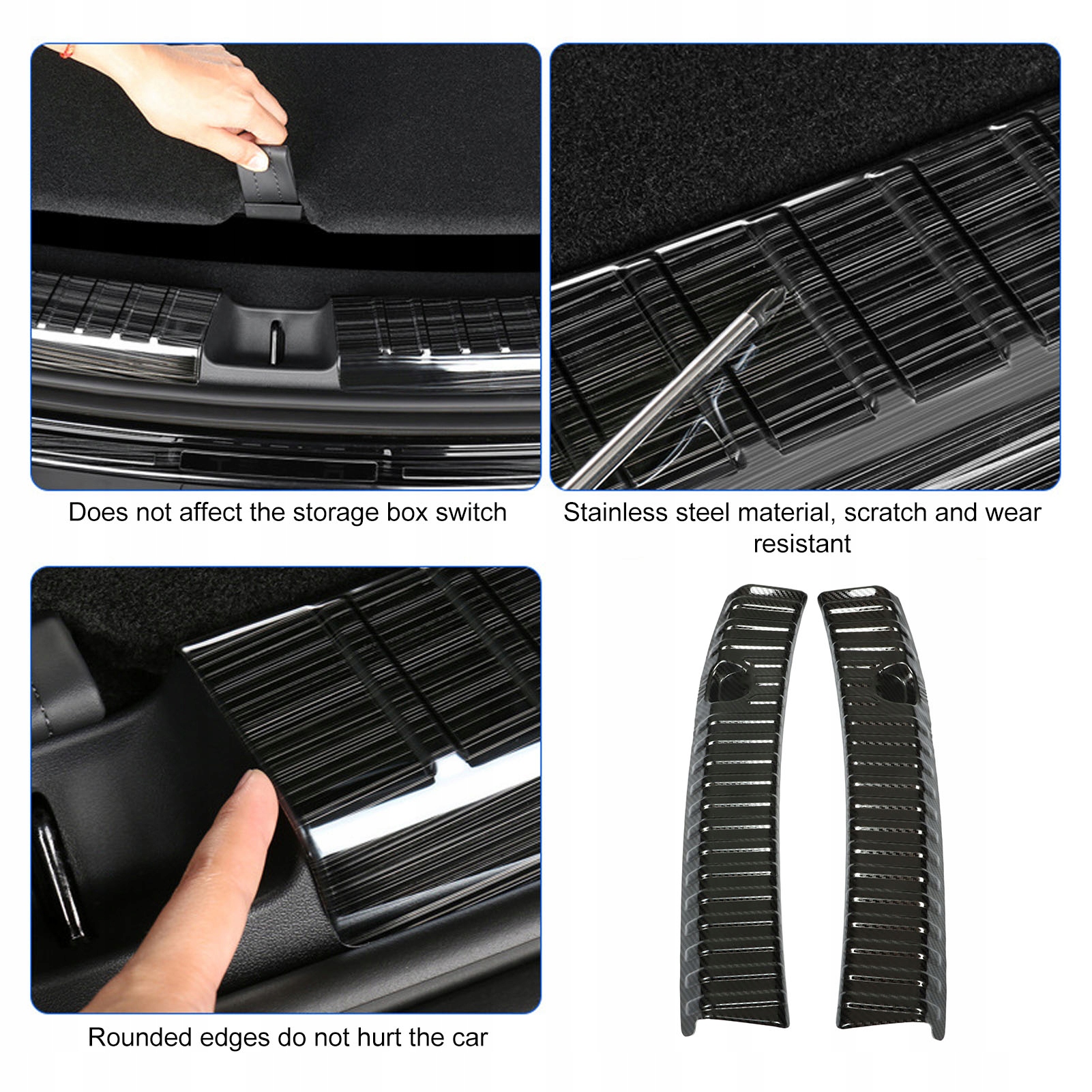 4. Разделенная пороговая крышка: защита порога двери багажника с разделенной конструкцией, подходит для исходного автомобиля, не блокирует дверь, не влияет на переключатель буфера обмена.
