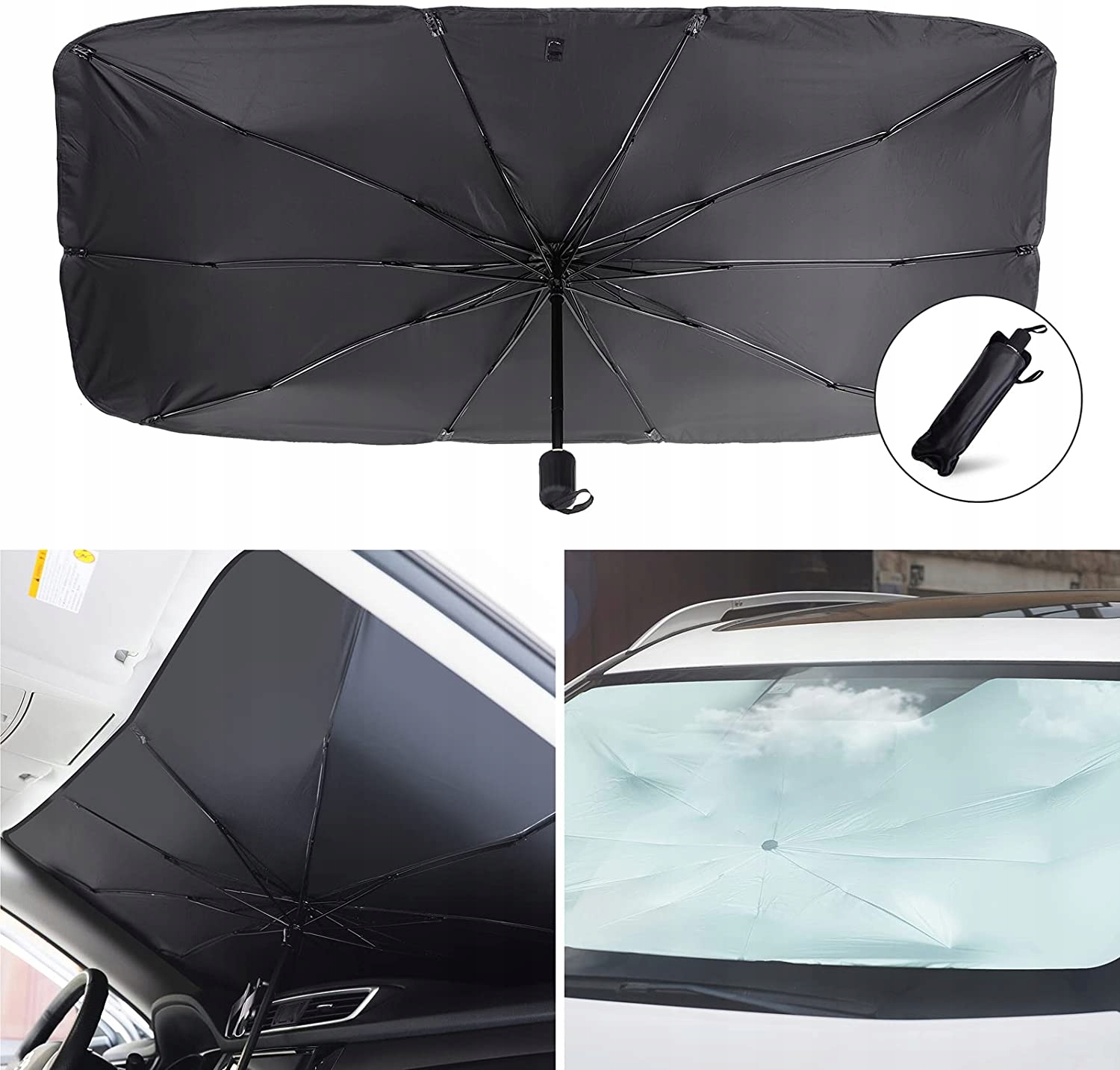 Коврик состоит из 10 стальных ребер, которые складываются и раскладываются, как зонтик. В сложенном виде он не займет много места в машине. В разложенном виде он защитит ваш автомобиль от чрезмерного нагрева внутри.