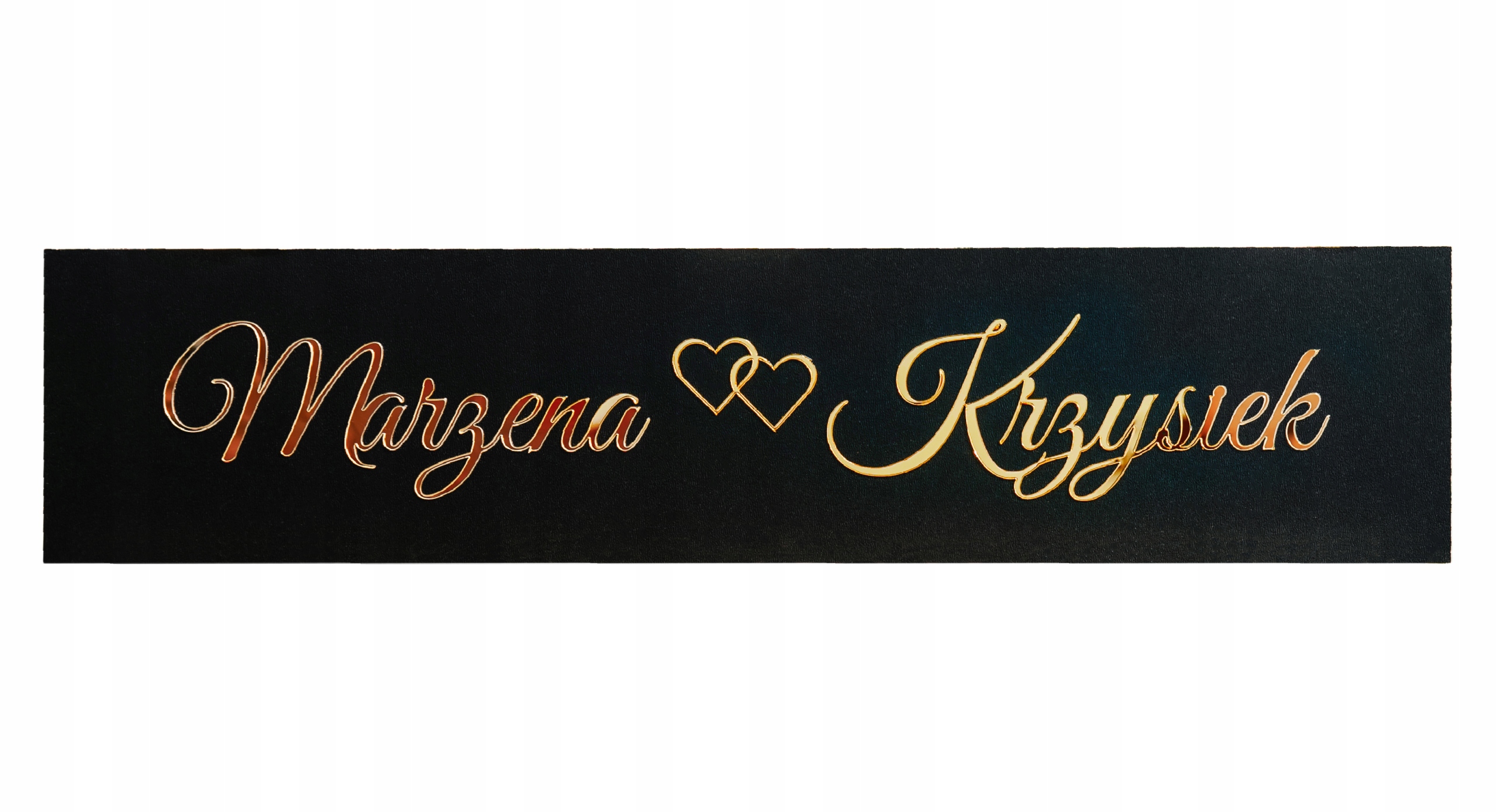 Табличка с декоративным текстом украсит автомобиль в день свадьбы. Надписи выполнены методом лазерной резки из золотого зеркального оргстекла и наклеены на черные плиты МДФ.