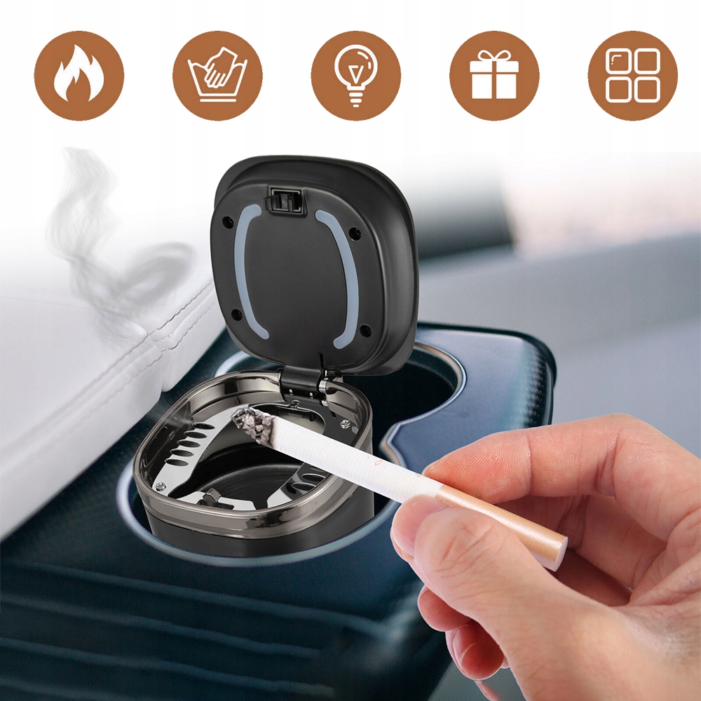 🔘 Автоматическая крышка: Практичная автоматическая крышка позволяет легко открывать и закрывать, защищая от распространения дыма и неприятных запахов в автомобиле, сохраняя при этом салон чистым и свежим.