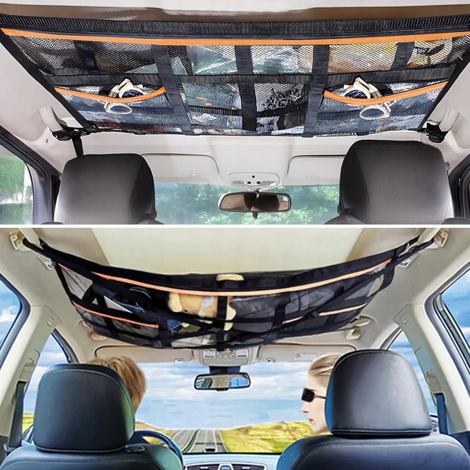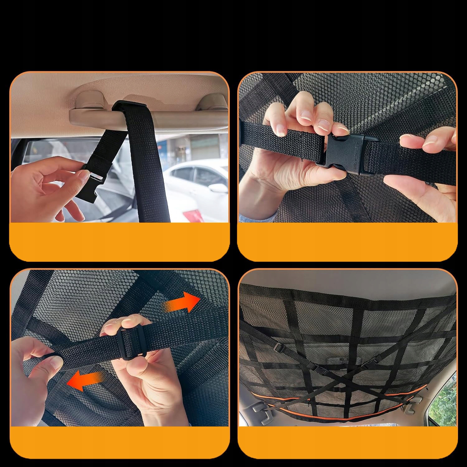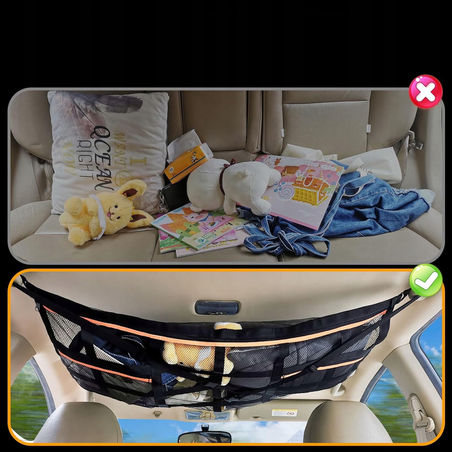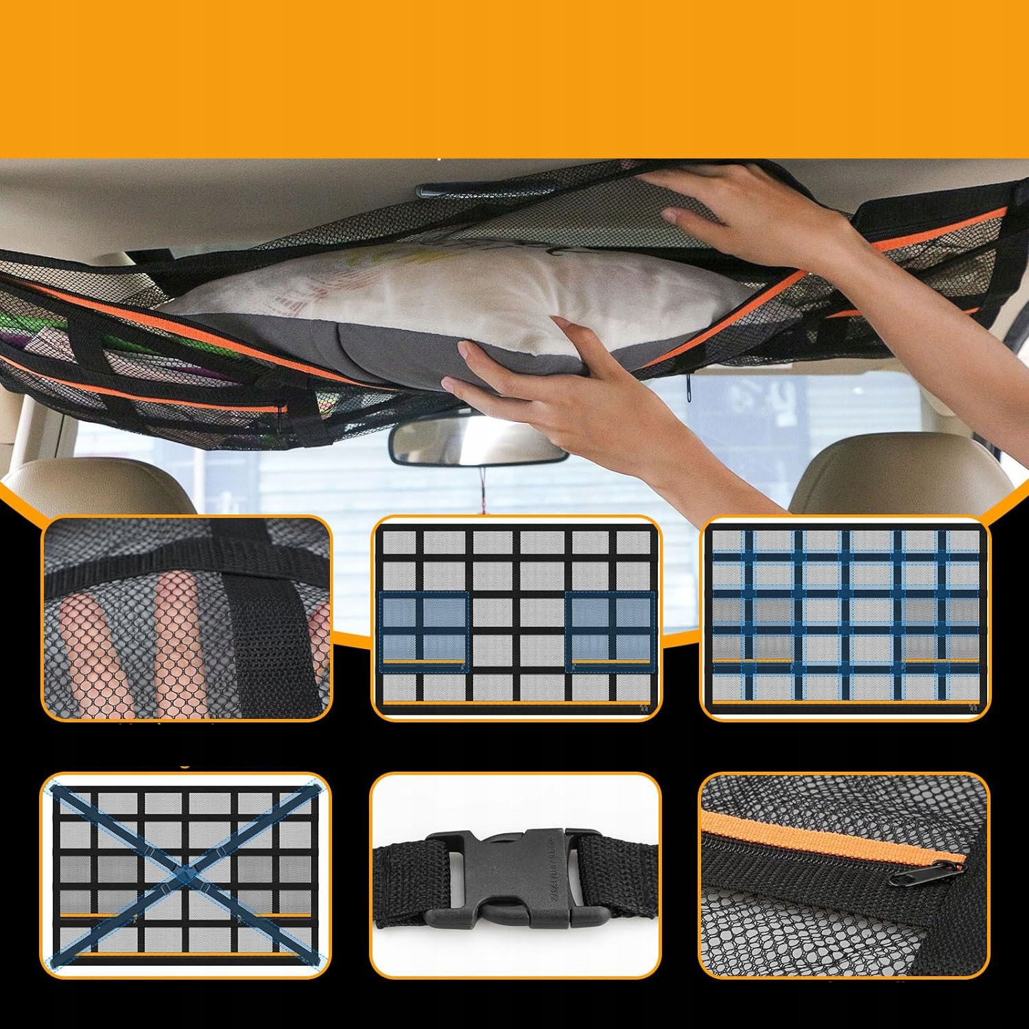 🚗 Большая емкость: благодаря размерам 90 см x 65 см эта двойная сетка багажа с двумя крючками обеспечивает достаточно места для багажа. Сетчатая багажная сумка на потолке автомобиля легко хранить носовые платки и различные игрушки для детей. Во время кемпинга вы также можете хранить большие легкие предметы, такие как подушки, одеяла, вниз. Это предотвращает движение или падение объектов во время вождения, оно долговечнее и безопасно.