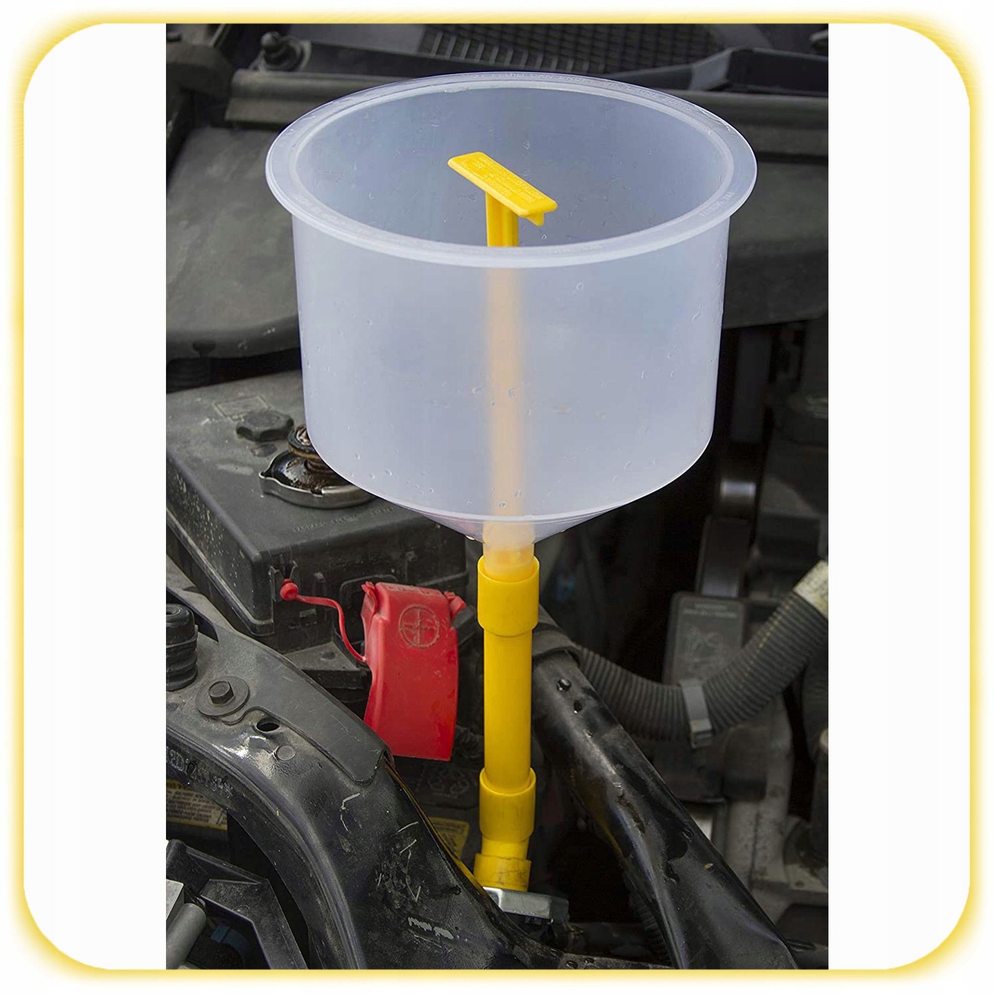 Основная воронка из прозрачного материала позволяет визуально контролировать уровень жидкости в режиме реального времени. Дополнительная желтая воронка хорошо подойдет для классического розлива и идеально подходит для небольших заправок.