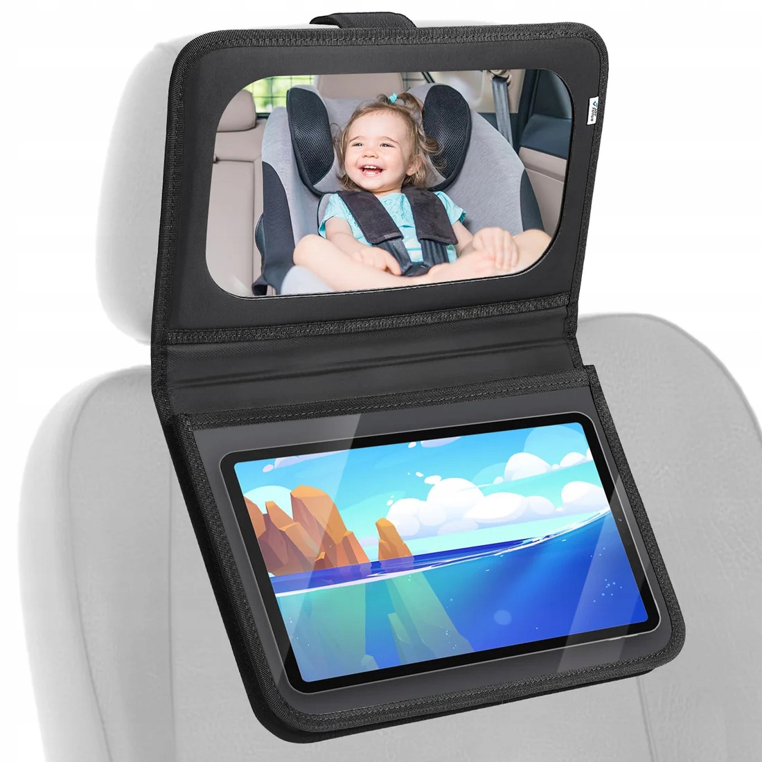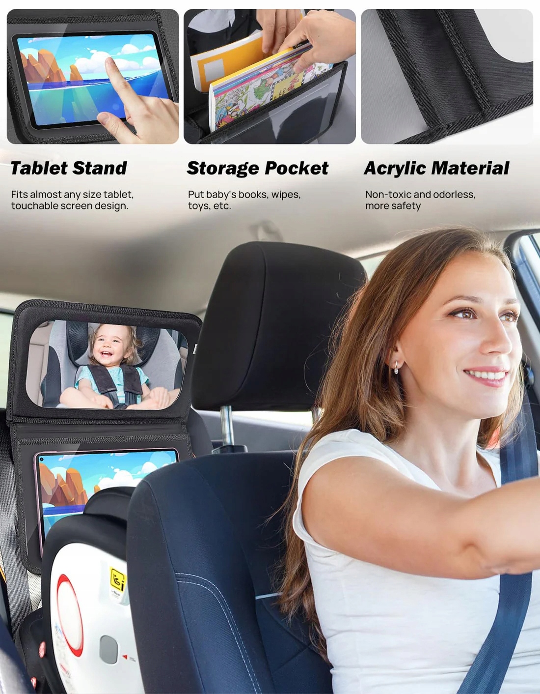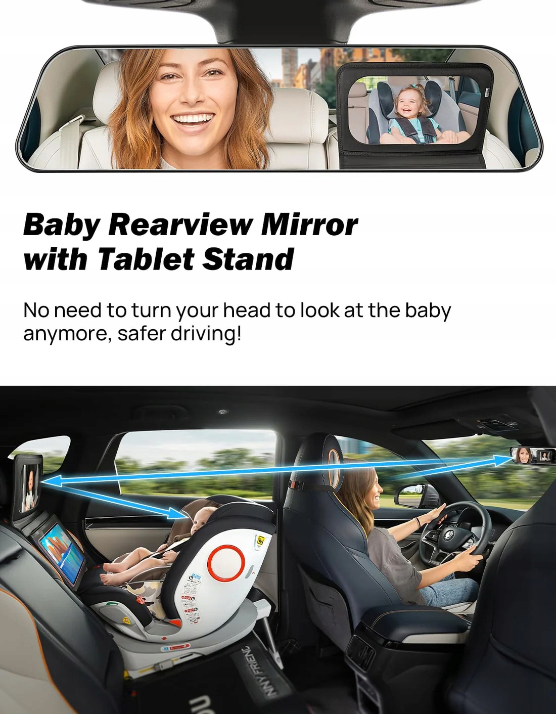 Мы предлагаем автомобильное зеркало JOYTUTUS, которое обеспечивает широкий угол обзора и устойчиво к разрушению. Кроме того, у него есть держатель для планшета, который позволяет вашему ребенку смотреть фильмы или играть в игры во время длительных поездок, что помогает ему отвлечься и не дает ему плакать. Держатель вмещает планшет размером до 13 дюймов (перед помещением планшета в держатель снимите чехол).