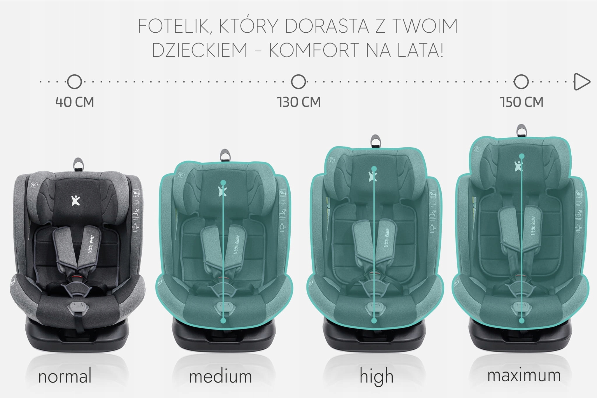 Сертифицированное автокресло LITTLE RIDER, соответствующее последнему утверждению i-Size, для детей ростом от 40 до 150 см. Сиденье оснащено поворотным на 360° сиденьем и креплением ISOFIX + Top Tether.