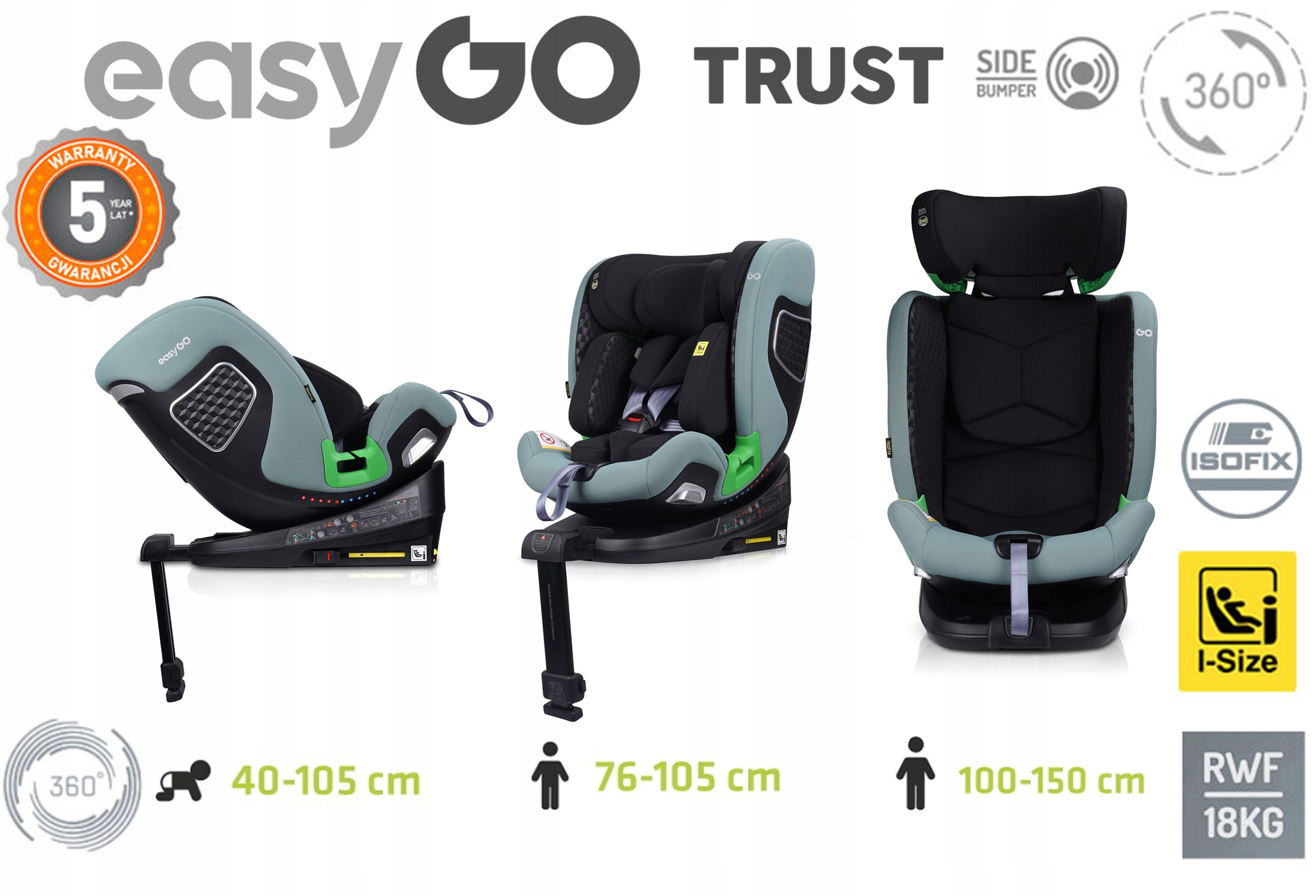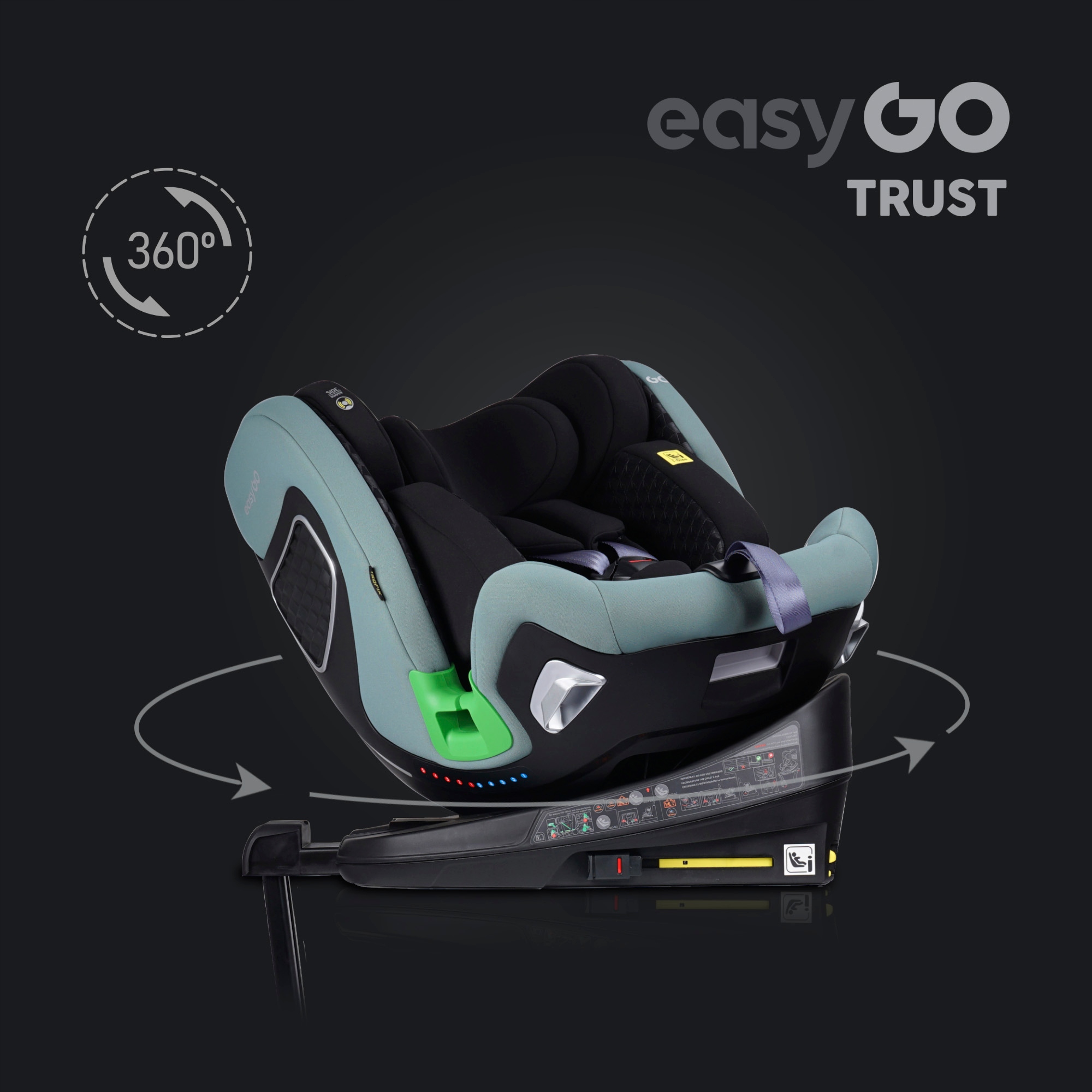 ✅ TRUST интегрирован с вращающейся платформой, которая работает в диапазон 360° градусов. Это позволяет расположить сиденье в двух плоскостях - передней и задней по направлению движения (RWF до 18 кг), а также удобно пристегивать малыша к сидению, а также вынимать его из автомобиля.