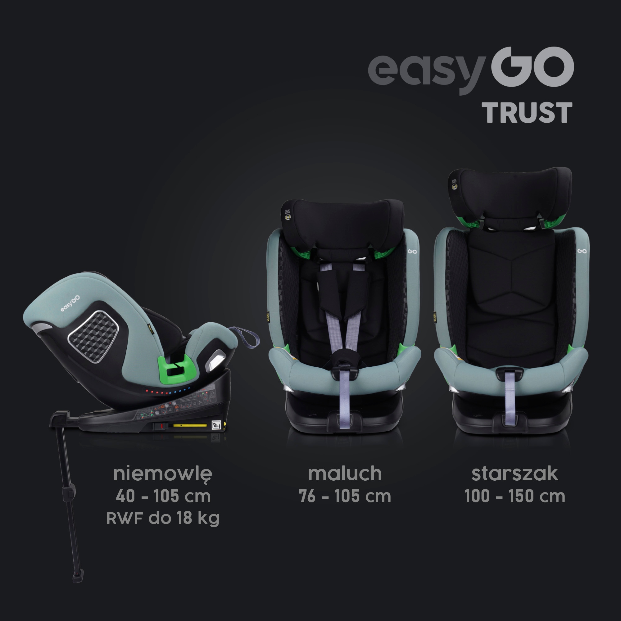 Однако мы рекомендуем перевозить ребенка в положении RWF до роста до 105 см, EasyGo TRUST — одна из первых моделей, обеспечивающих такую возможность. возможность и адаптирован к ней