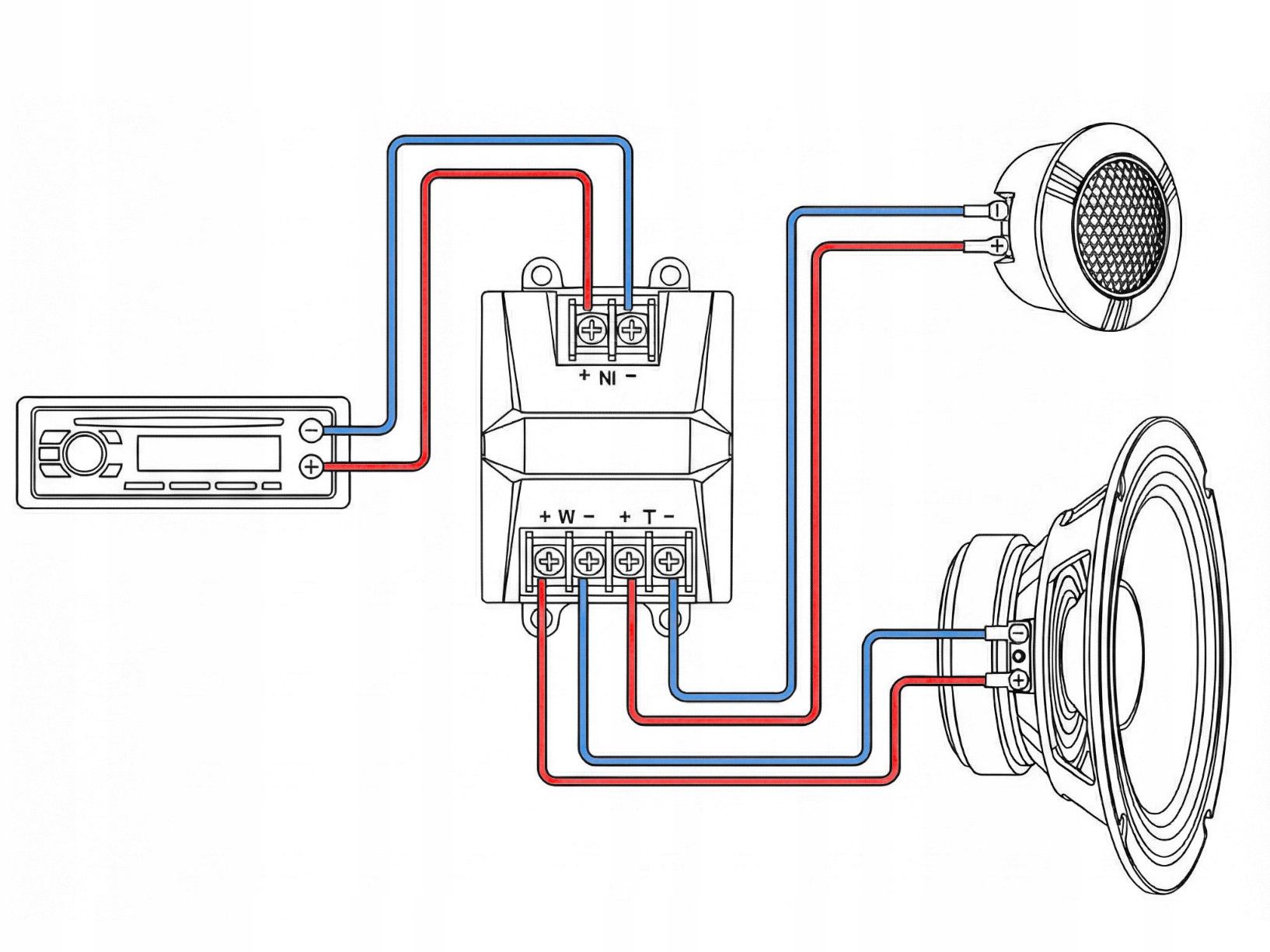 • +W/–W – выход на НЧ динамик 6,5 дюйма