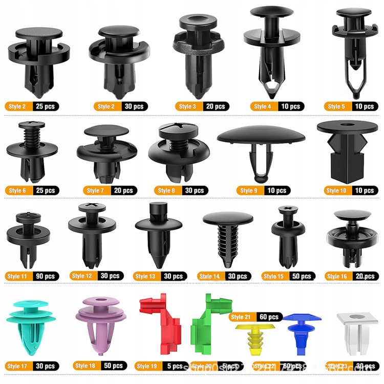 Этот набор содержит 680 монтажных зажимов 23 наиболее часто используемых размеров, которые подходят для большинства моделей автомобилей, доступных на рынке.