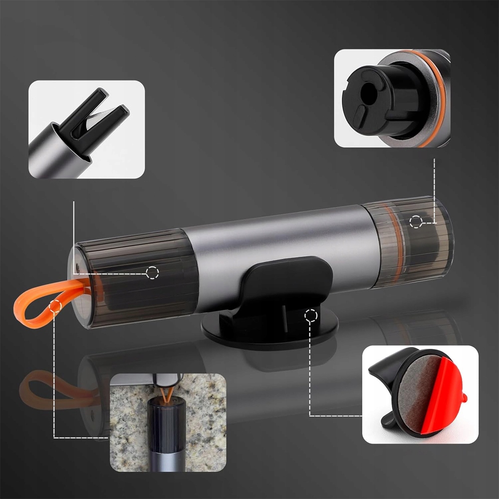 • В чрезвычайной ситуации каждая секунда на счету — этот многофункциональный инструмент сочетает в себе стеклобой и нож для ремня безопасности.