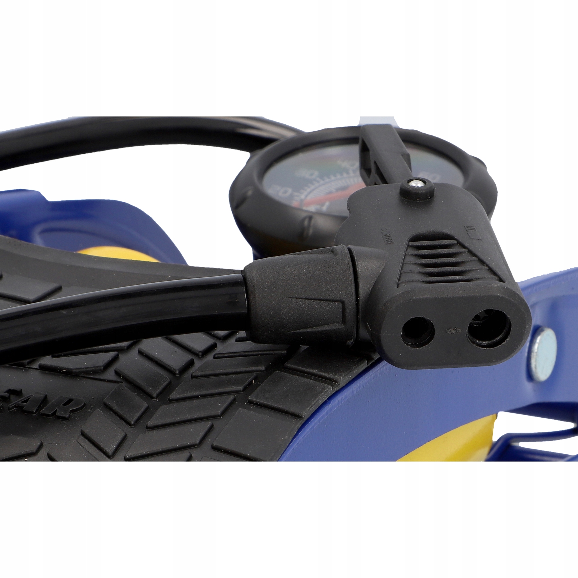 Манометр измеряет давление до 7 бар, номинальное давление — 2,5 бар. Тонометр защищен резиновым чехлом, устойчивым к ударам и ударам. Ножной насос благодаря двойной головке подходит к большинству популярных клапанов.