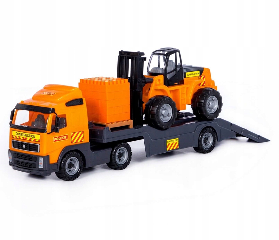 Большой буксир, перевозящий погрузчик с кубиками. Станет прекрасным подарком любому ребенку. Грузовик имеет подвижную рампу, а погрузчик оснащен полнофункциональными блоками. Грузовик имеет возможность отсоединения и присоединения полуприцепа. Транспортные средства идеально подходят для игр как дома, так и на природе. Набор полностью изготовлен из прочного пластика и обладает высокой ударопрочностью, что обеспечивает долгую и безопасную игру.