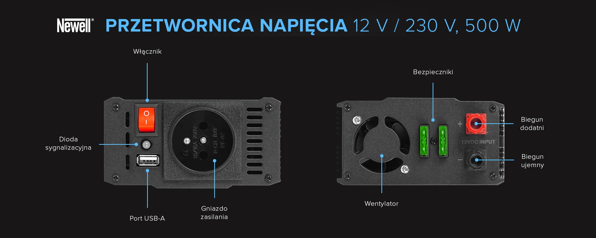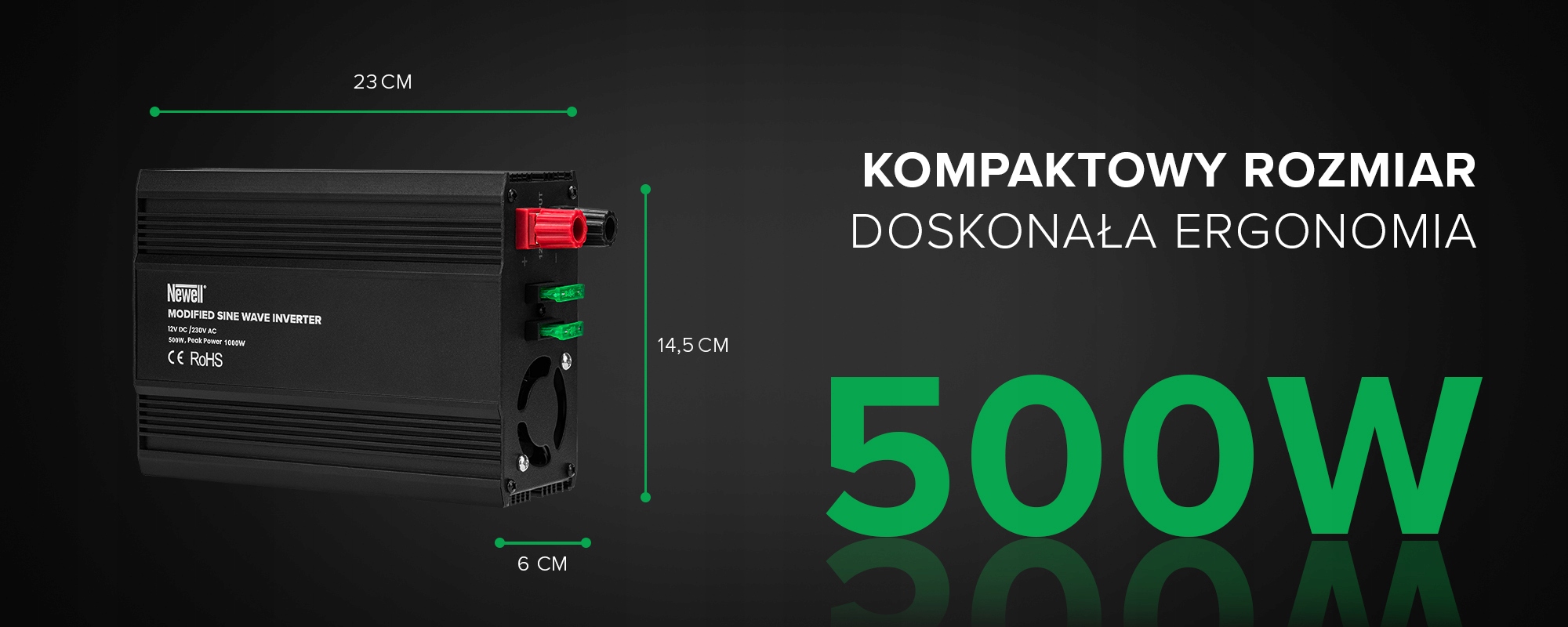 Преобразователь напряжения Newell с модифицированной синусоидой – 12 В/230 В, 500 Вт – идеальный выбор для людей, которые часто путешествуют или хотят использовать свои любимые устройства там, где нет доступа к традиционным электрическим розеткам. Благодаря этому вашим универсальным источником питания станет аккумулятор или автомобильный прикуриватель. Устройство оснащено 1 традиционной электрической розеткой (стандарт E) и 1 розеткой USB-A. К преобразователю можно легко подключить такие устройства, как обогреватели, ноутбуки, смартфоны, планшеты, мясорубки и многие другие. Максимальная полезная мощность инвертора — 500 Вт. В комплекте помимо обычных проводов и кабеля прикуривателя вы также найдете удобные кабели с клеммами (зажимами), что еще больше облегчит подключение устройства к аккумуляторам.