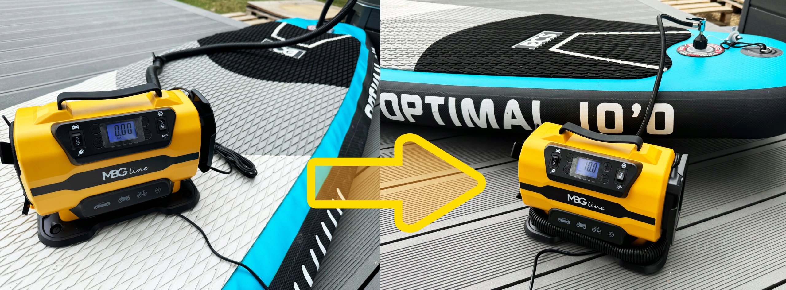 ✔️ Только у нас был проведен тест надувания SUP-доски за несколько минут, сначала с использованием воздушного шланга и функции обдува, а на втором этапе с помощью компрессора для увеличения давления. высокое давление