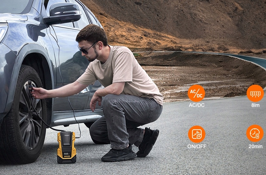 Воздушный насос имеет двойную структуру питания, которая позволяет переключаться между сетевым режимом 230 В и режимом мощности автомобиля 12 В. Конструкция двойного источника питания AC/DC нашего портативного воздушного компрессора может взять энергию как из автомобиля, так и из стены в гараже. Благодаря этому вам никогда не придется беспокоиться о том, что у вас не хватит энергии в путешествиях.