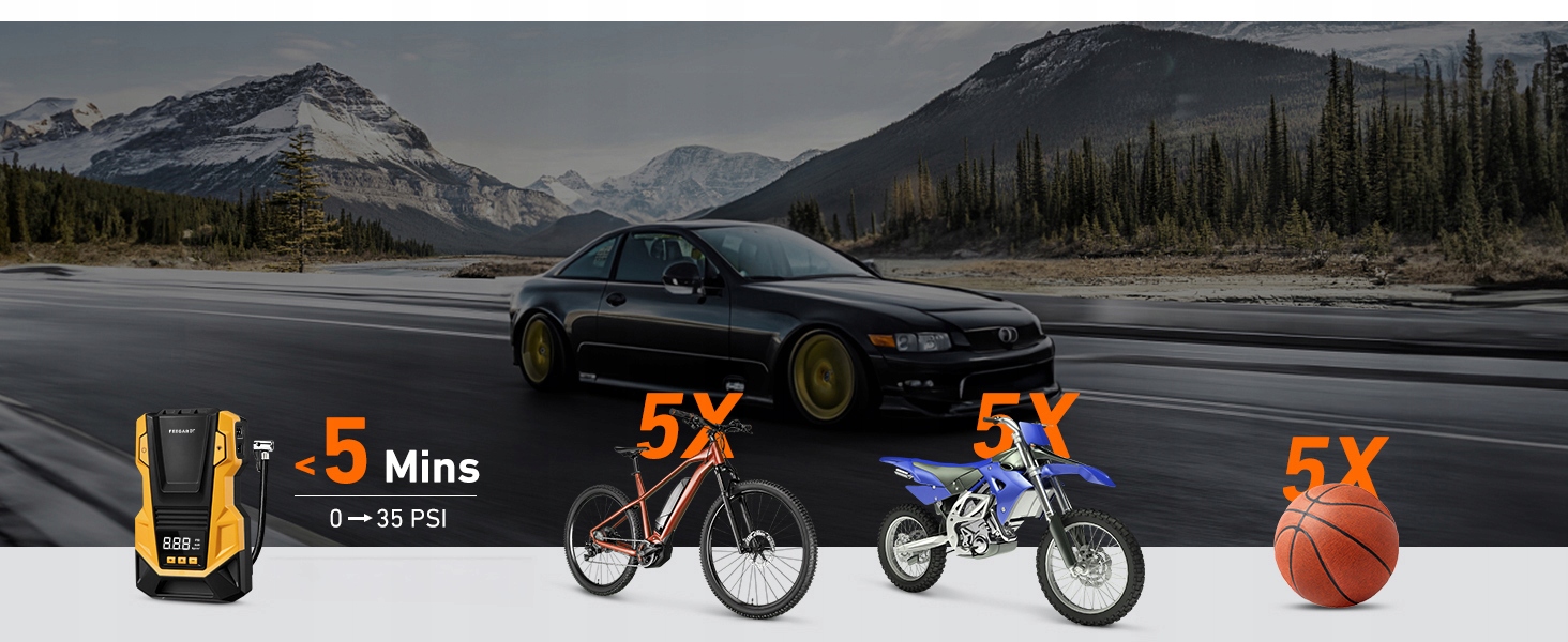 Насос может быстро надувать шины при максимальном давлении 150 фунтов на кв. Дюйм и воздушного потока 36 л/мин. Всего за 1 минуту насос может надуть шину от 25 до 36 фунтов на квадратный дюйм и в течение 5 минут, чтобы надуть автомобильную шину от 0 до 36 фунтов на квадратный дюйм. Идеально подходит для перекачки автомобилей, мотоциклов, скутеров, велосипедов, шаров и других надувных лодок.