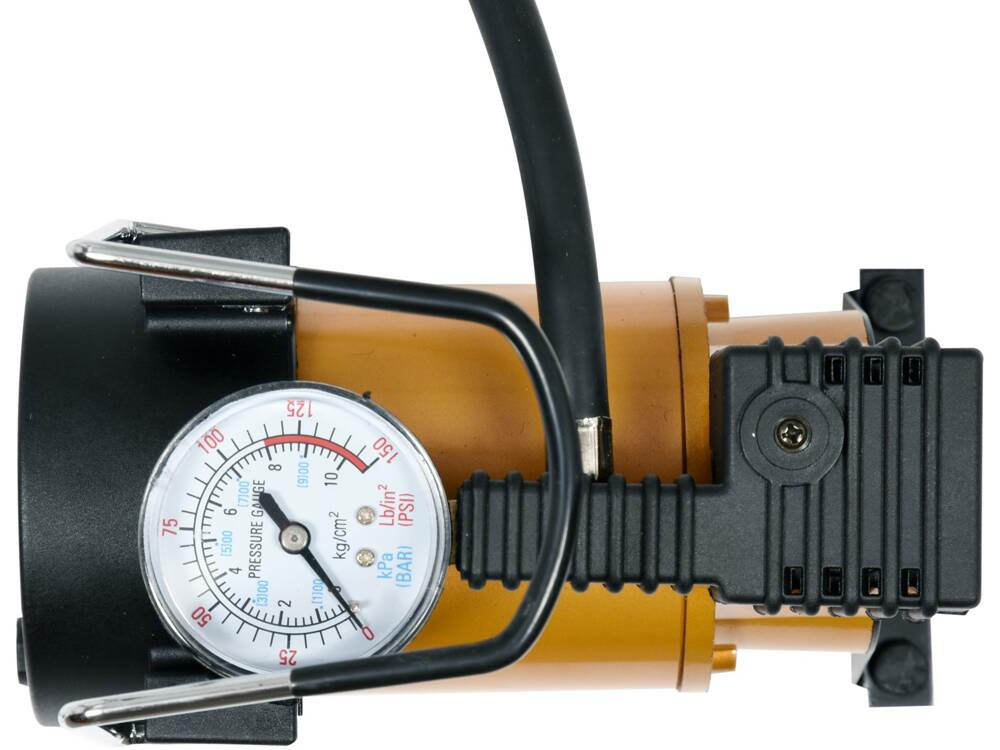 Компактный компрессор с точным датчиком давления b> с напряжением подачи 12 В. Предназначен для накачки колес и внутренних труб, оснащенных клапаном в автомобилях, мотоциклах и велосипедах, а также - с использованием заменяемых кончиков - матрасы, понтоны, шарики. PSI (10 бар - 1 млн.) Установите: