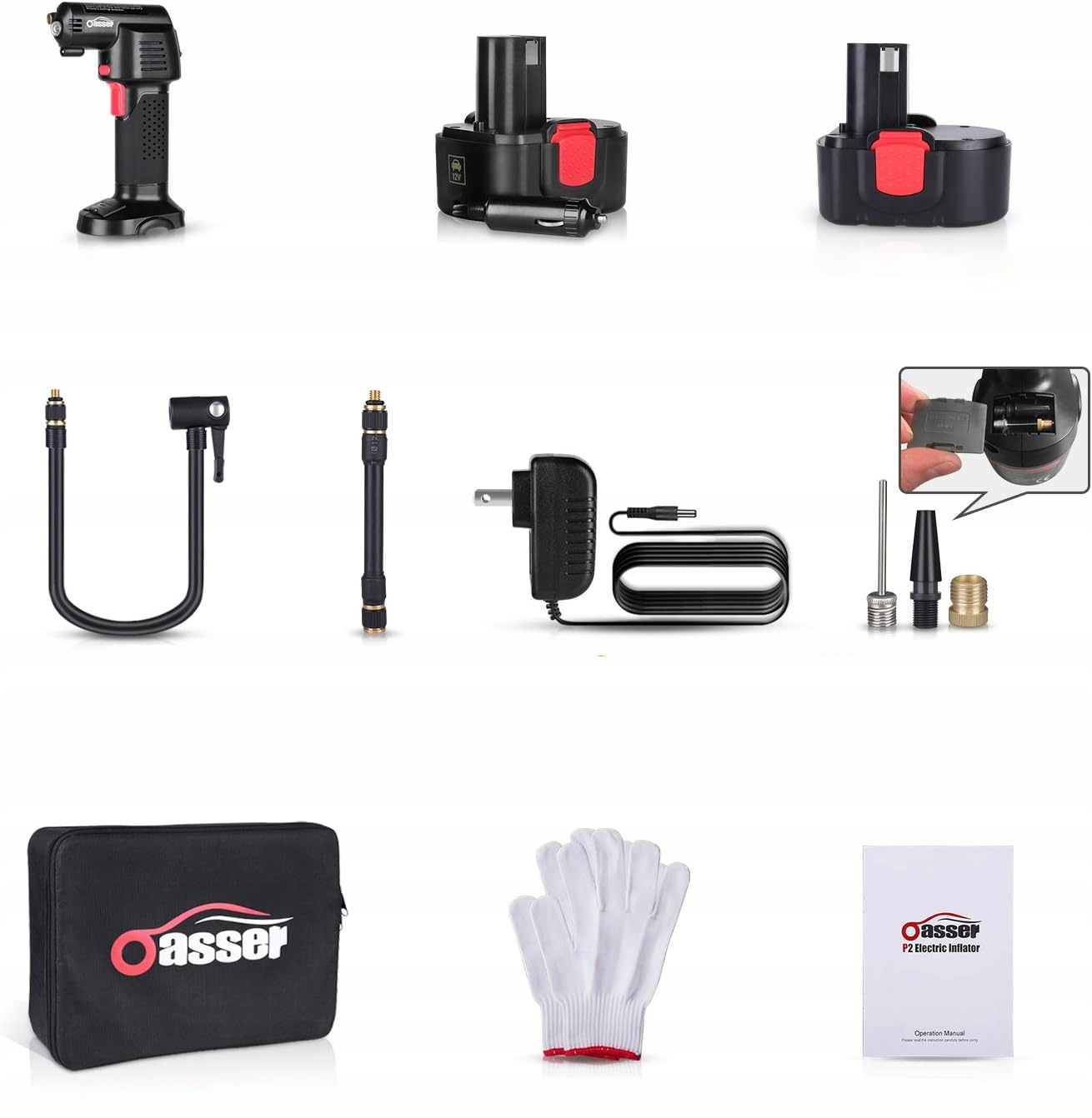 В комплекте с насосом для шин Oasser предлагает: 1 аккумулятор, автомобильное зарядное устройство на 12 В, бытовое зарядное устройство на 110 В, 1 клапан Presta, 1 шариковую иглу, 1 игрушечную насадку. В комплект также входят 2* воздушные шланги (35 см и 12 см), рабочие перчатки и сумка для хранения.