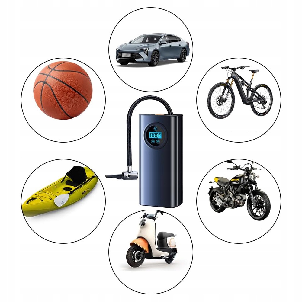 CAR, велосипед, мотоцикл, режим сферической инфляции, любой переключатель, возможность установить значение давления, автоматическое закрытие установленного значения, предотвращение чрезмерного инфляции, безопасное использование. До 150 фунтов на квадратный дюйм вы можете быстро надуться в течение нескольких минут.