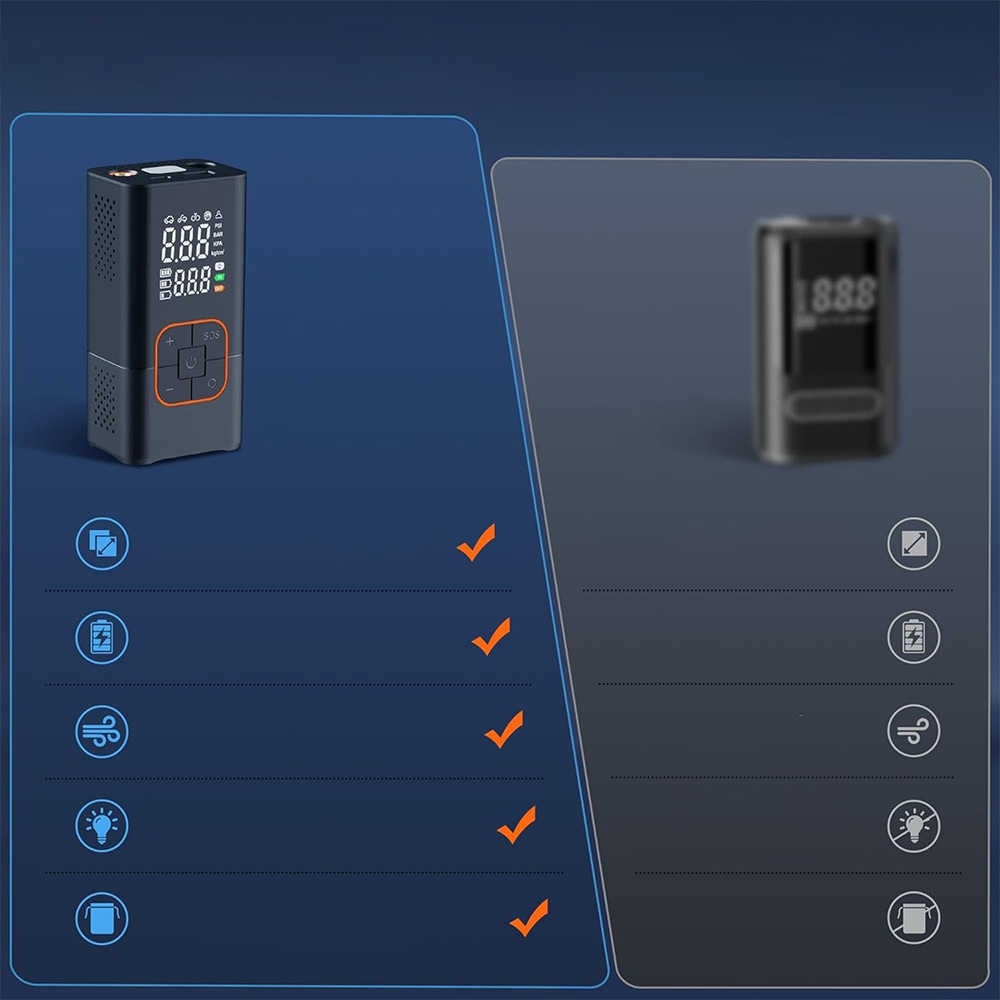 Этот насос не только служит накачкой автомобильных шин, но также оснащен входным портом USB-C и выходным портом USB-A, а также встроенным большим аккумулятором, который можно использовать в качестве портативного источника питания для зарядки мобильных телефонов или других электронных устройств. Верхний светодиодный фонарь имеет три режима освещения (SOS, постоянный свет, мигающий свет), что позволяет легко накачивать или менять шины в темноте, а также отправлять предупреждающие сигналы другим транспортным средствам в ночное время.