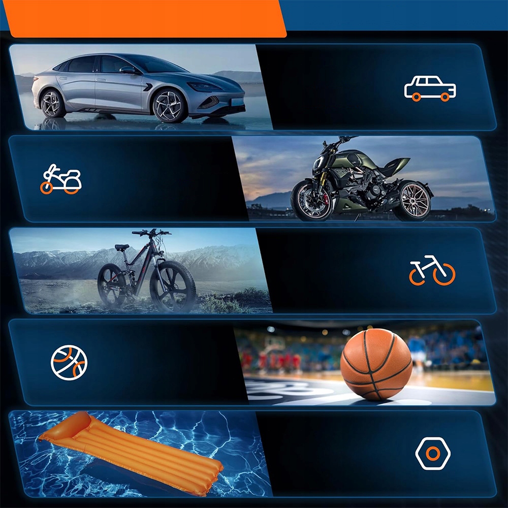 - ✔️ Встроено 5 режимов накачивания и оснащено 4 различными адаптерами насадок для удовлетворения различных потребностей в накачивании (например, велосипедов, мотоциклов, автомобилей, внедорожников, мячей, SUP, каяков, воздушных шаров и т. д.). Более того, вы можете свободно переключаться между 4 единицами измерения (psi, бар, кПа, кг/см²).