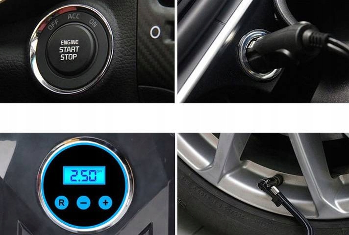 После запуска автомобиля вставьте кабель питания в прикуриватель, затем поместите насадку для накачки в клапан, введите давление, которого вы хотите достичь на компрессоре, включите компрессор, который автоматически отключится после накачивания колеса.