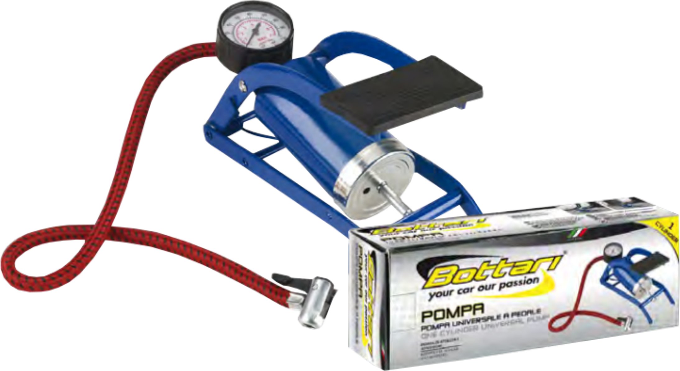 Одноцилиндровый ножной насос итальянской компании Bottari с манометром. Высокая эффективность обеспечивает быструю откачку. Прочная конструкция обеспечивает длительное использование. Ножка имеет противоскользящую резину. В комплект входят две разные насадки.