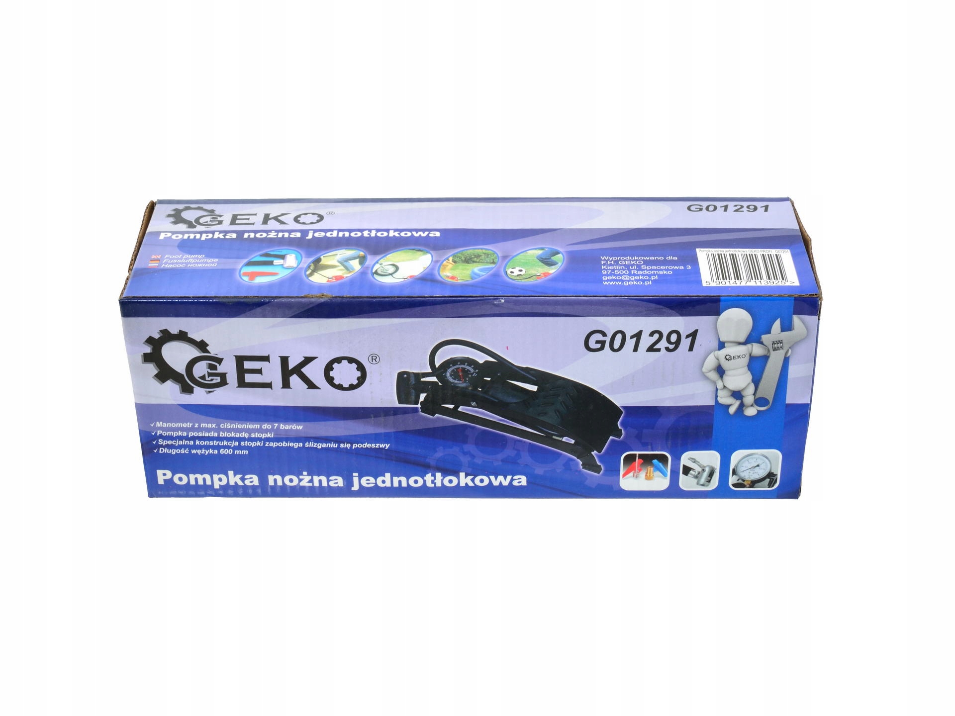 Однопоршневой ножной насос GEKO PROFI Ножной однопоршневой насос для накачивания колес легковых автомобилей, велосипедов, мотоциклов, самокатов, мячей и т. д. В комплект входят универсальные насадки для накачивания, в том числе: мячей и матрасов. Особенности продукта: один цилиндр обеспечивает быстрое и эффективное накачивание; специальная противоскользящая конструкция опоры; фиксатор стопы; игольчатый манометр с шкалой измерения 0–7 бар. Длина шланга 600 мм. В комплект входят 2 универсальные насадки. Базовые размеры: 280 x 80 мм. Прочная конструкция.