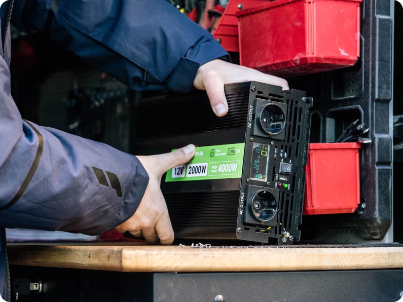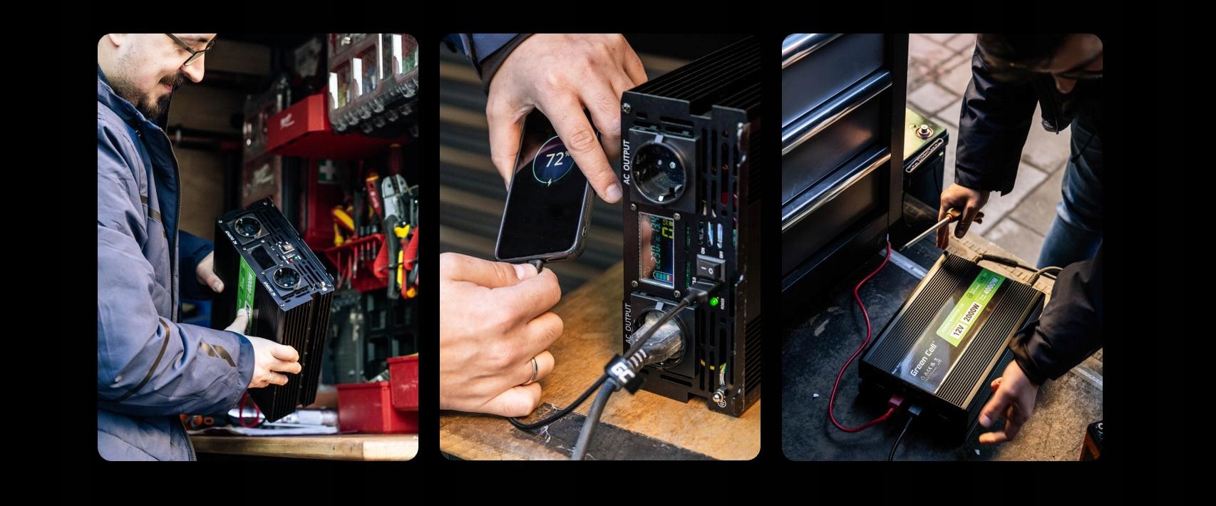 - Просто подключите преобразователь к аккумулятору, включите его и устройство готово к использованию! Весь процесс чрезвычайно интуитивно понятен, и вы можете отслеживать все ключевые параметры на четком дисплее. Благодаря ему вы будете иметь представление о текущем питании и уровне заряда аккумулятора, что существенно упрощает работу.