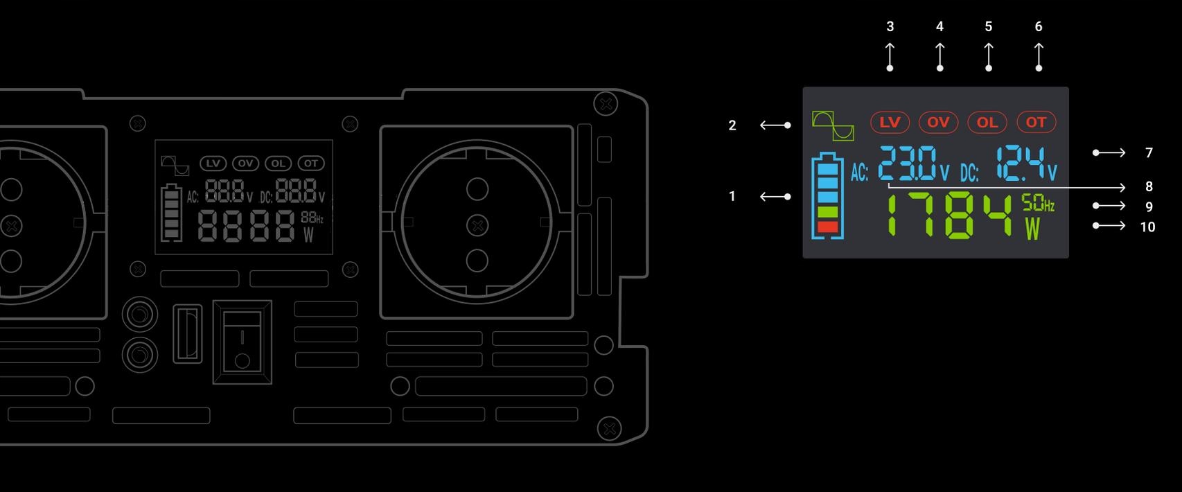 Преобразователь Green Cell PowerInverter LCD 24 В 3000 Вт/6000 Вт – описание информации, отображаемой на ЖК-дисплее: