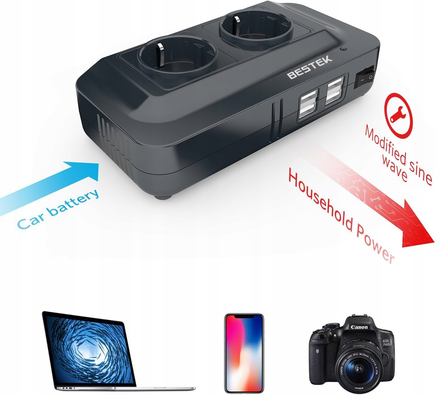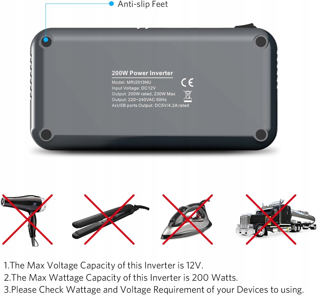 САМЫЙ УДОБНЫЙ В МИРЕ — портативный и многофункциональный инвертор мощностью 200 Вт от 12 В до 220 В отвечает потребностям семьи и путешествий. Высокая эффективность преобразования ≥90%. Гарантия качества на 24 месяца √ 4 USB-ПОРТА + 2 ВЫХОДА переменного тока - 2 USB-порта для зарядки смартфонов, планшетов, телефонов Android и других устройств с питанием от USB √ 6 БЕЗОПАСНОСТИ - Защита от перегрева, низкого входного напряжения, высокого входного напряжения , защита от перегрузки, короткого замыкания и тока, не беспокойтесь об электричестве. Этот трансформатор имеет модифицированную прямоугольную синусоидальную волну с функцией плавного пуска для плавного переключения и мягкого переключения. √ МАТЕРИАЛ - PC V0 (UL94), глянцевая УФ-поверхность обеспечивает эффективную устойчивость к ударам, давлению, нагреву и огню
