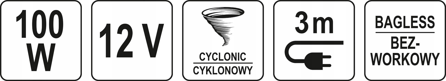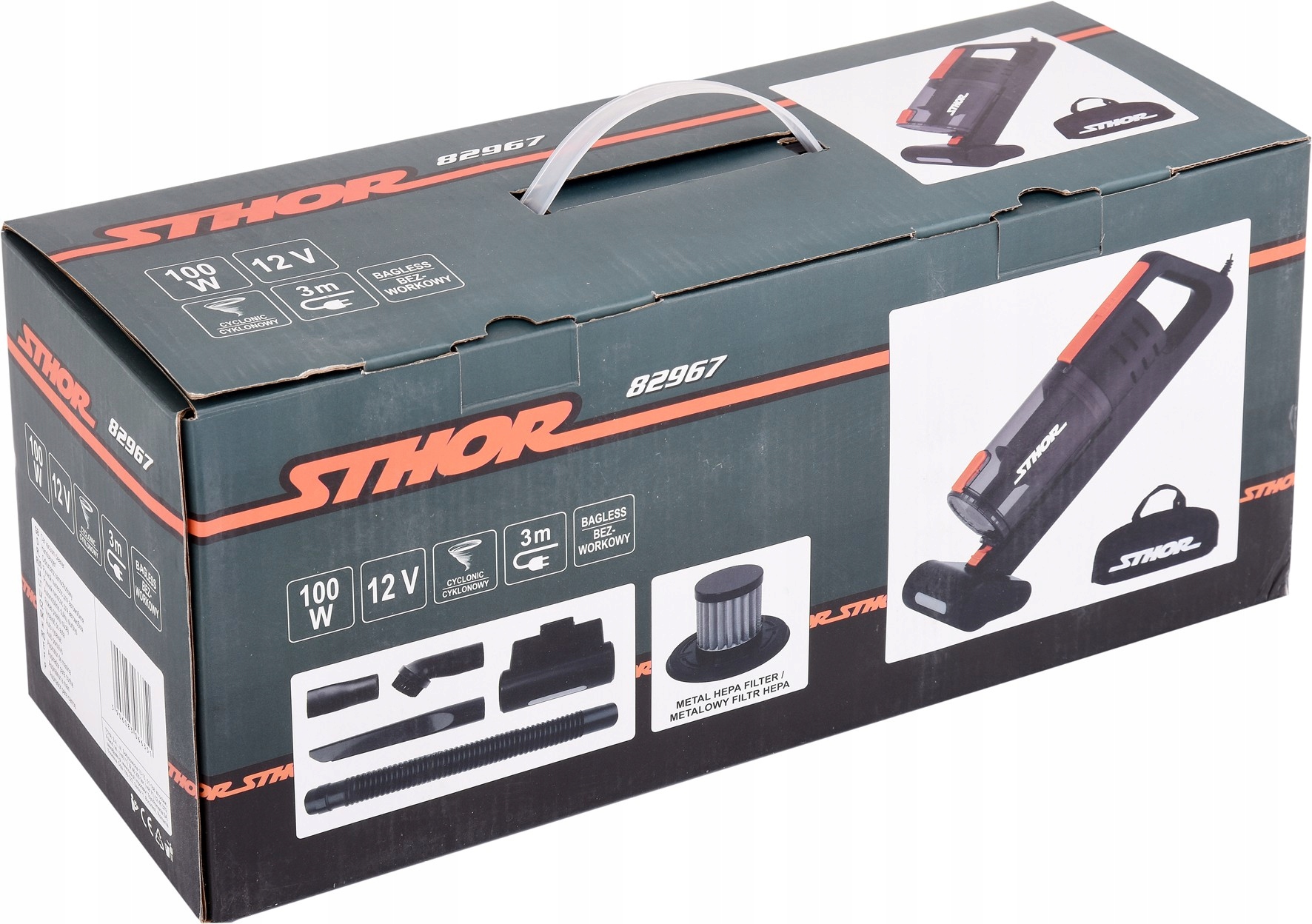 Автомобильный пылесос без мешка от STHOR мощностью 100 Вт и очень высоким вакуумным давлением 5,5 кПа.