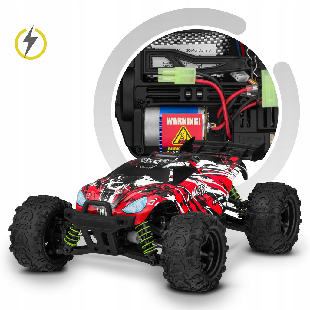 Спортивные решения и сенсационная производительность-не единственные преимущества X-Monster 3.5. Большой дизайн, заставляет вождение этого автомобиля обеспечивать еще большие впечатления, и преодоление препятствий - это весело до совершенно другого уровня. Это не маленький быстрый автомобиль, это настоящий монстр среди автомобилей RC.