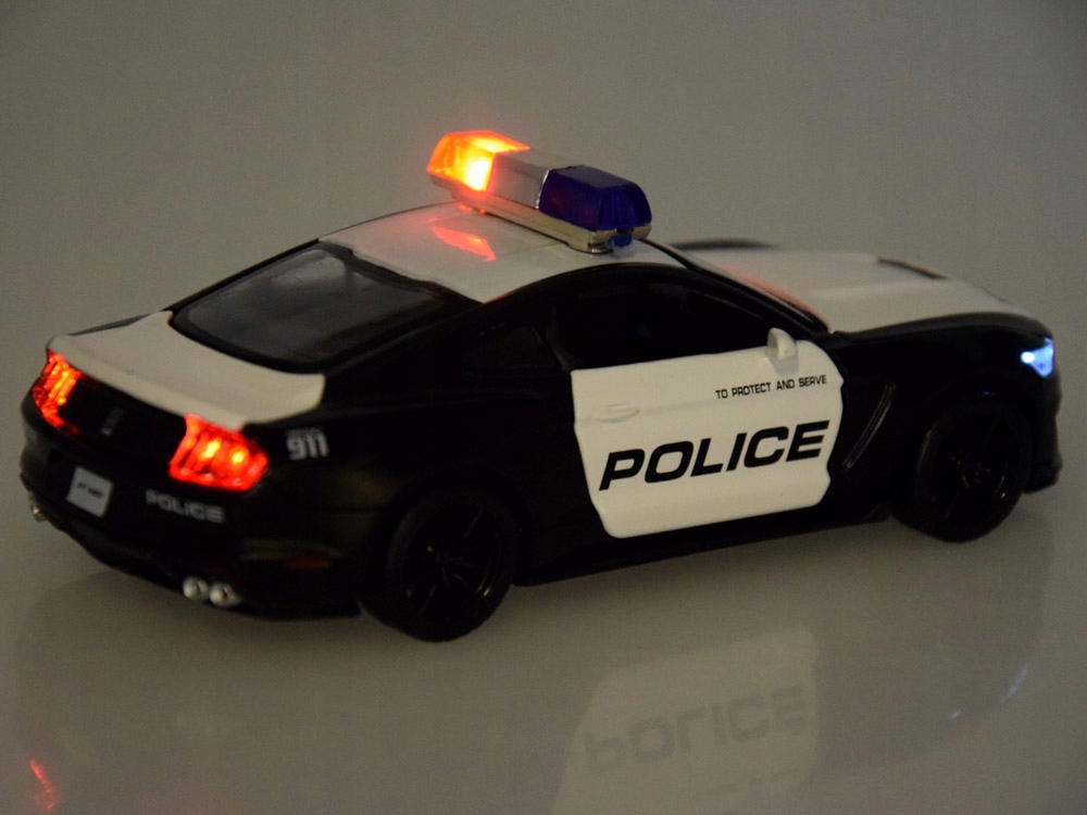 - Полицейский автоматический Ford Mustang Shelby GT350 по шкале 1:32 станет отличным дополнением к коллекции автомобильных моделей. Полицейский автомобиль был очень тщательно и эстетически сделан с вниманием к наименьшим деталям, что, вероятно, порадует каждого маленького водителя. Автомобиль имеет открывающиеся двери, а также звуковые и легкие эффекты. У Ford Shelby есть привод Friction Power, то есть, когда вы выходите на гладкую, четную поверхность, он пройдет вперед. Автомобиль также работает на толкателе. После открытия двери и нажатия на полицейскую машину Ford Shelby GT350, мы услышим сигналы тревоги на землю. Звуковые эффекты сопровождаются огнями в передней и задней части автомобиля и мигающие петухи на крыше автомобиля. Весь корпус автомобиля - металл, резиновые колеса, шасси сделано из пластика.