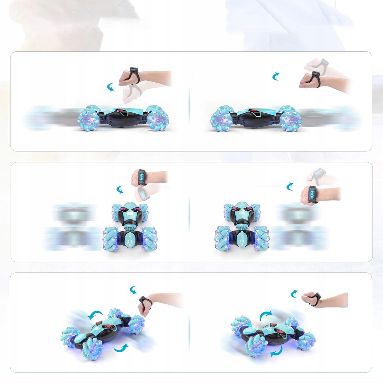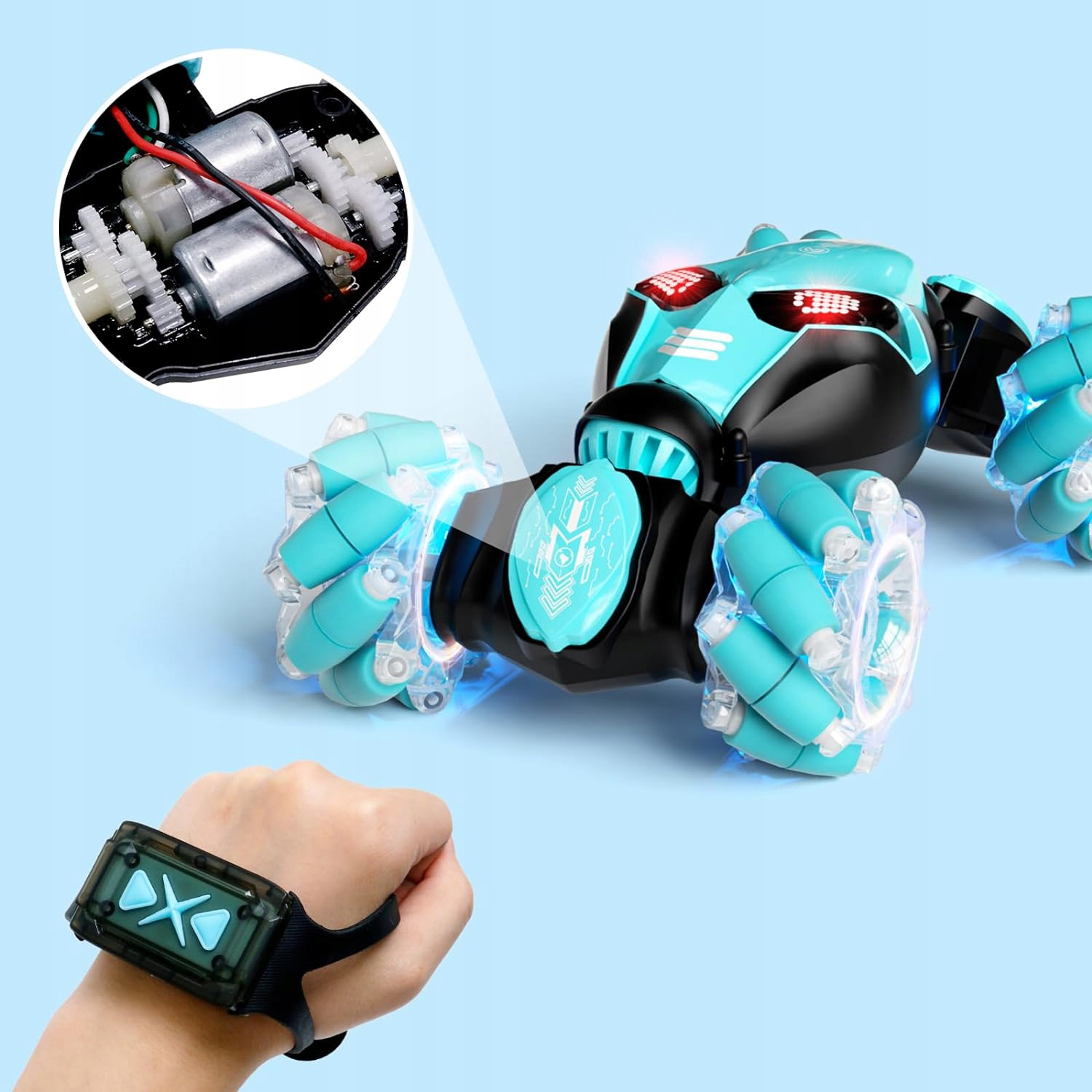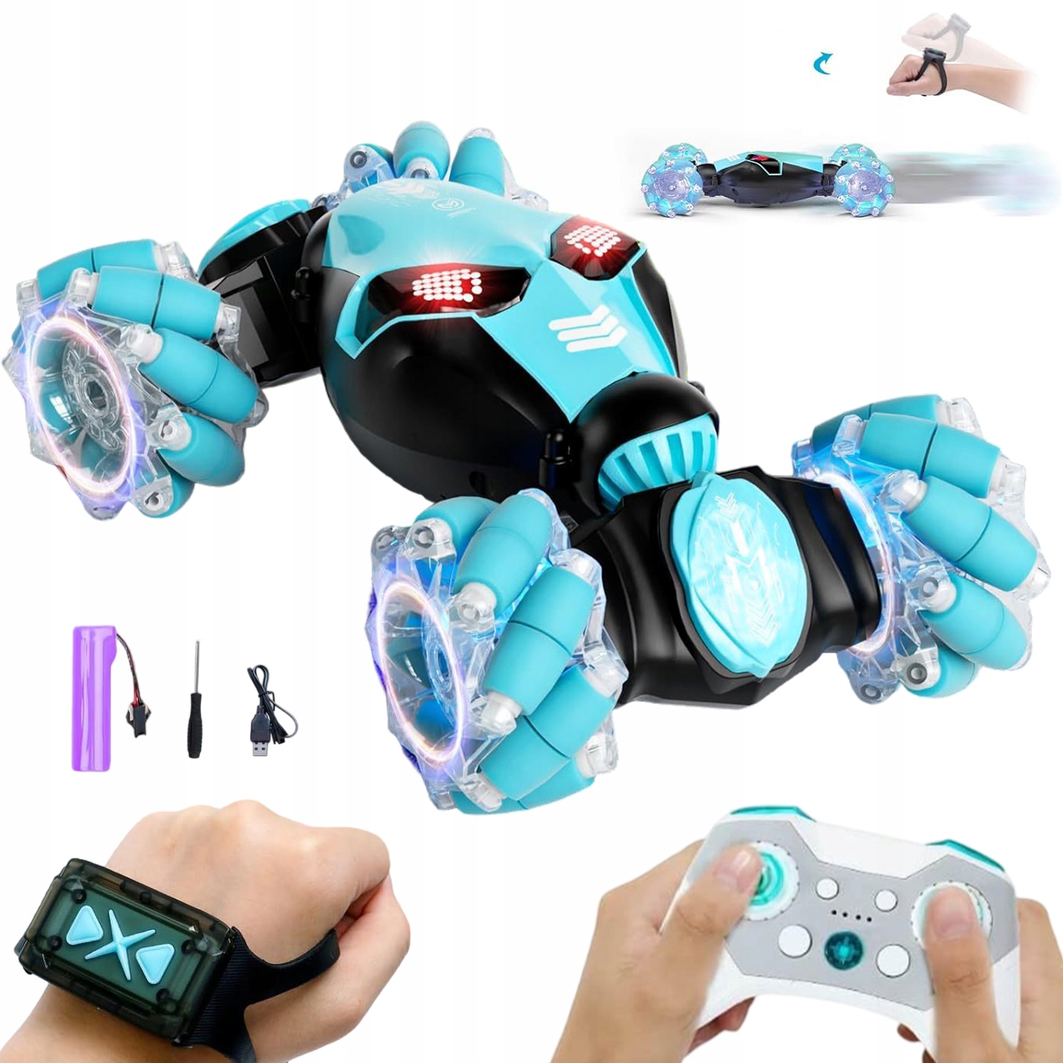 🤖【Dual Control Magic】Переключайтесь между пистолетным пультом 2,4 ГГц и часами с датчиком жестов за считанные секунды — наклоняйте запястье, чтобы дрейфовать, поворачивайтесь, чтобы сальто, нажимайте вперед, чтобы броситься вперед. Дети осваивают акробатику быстрее, чем когда-либо, а взрослые наслаждаются футуристическими радиоуправляемыми играми без дополнительных приложений и проблем с сопряжением.