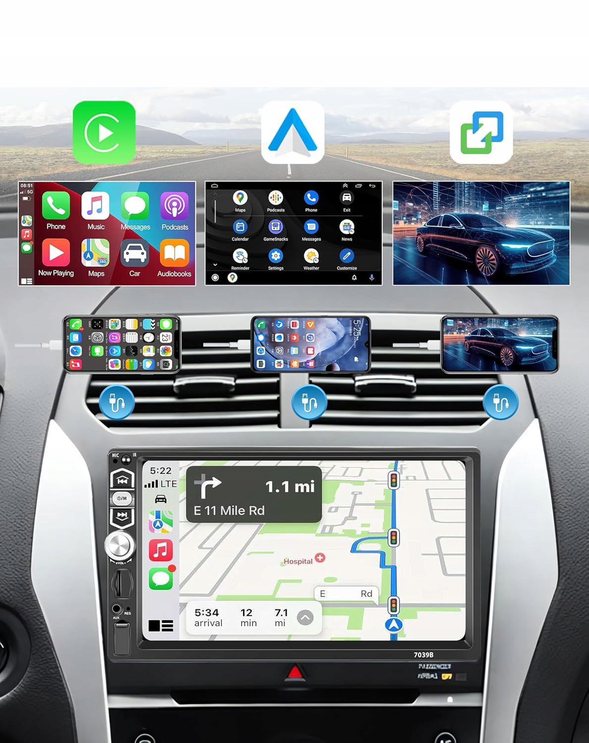 Car Radio 1 DIN USB Android Auto Apple CarPlay Link