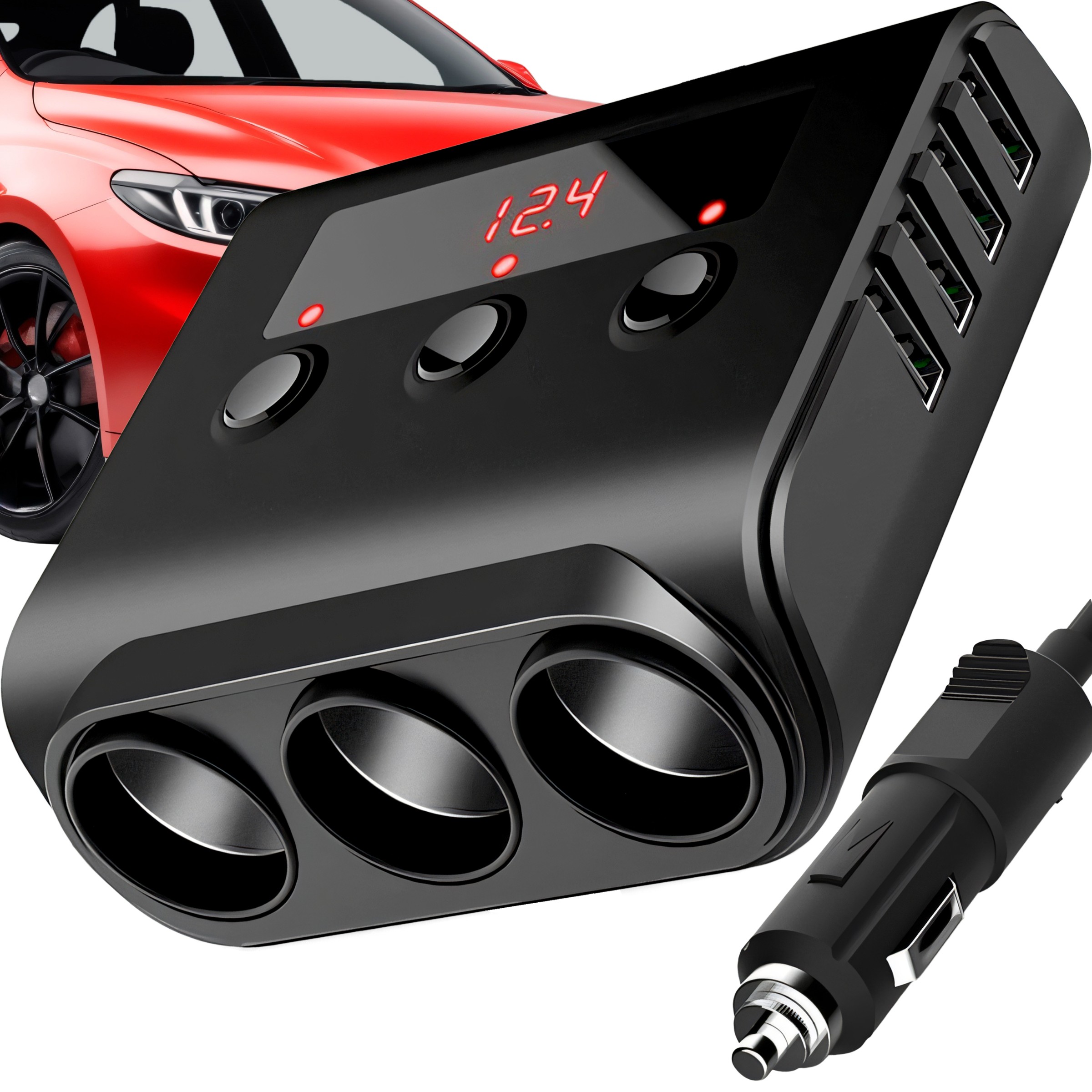 ✍️ Автомобильный распределитель ☺️ Размеры: компактный дизайн ✔️ Источник питания: 12-24 В постоянного тока ☀️ Выход USB: 5 В/3,6 А ✏️ Система защиты от перенапряжения ✉️ 3 выключателя питания для дополнительных гнезд прикуривателя ♥️ Дисплей с вольтметром: цифровой светодиодный ♠️ Длина кабеля: прибл. 65 см ✔️ Запасной предохранитель ⭐