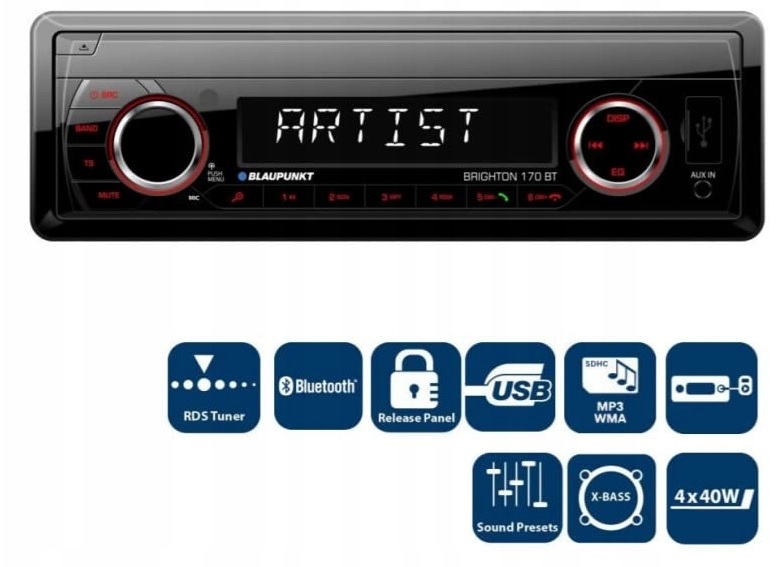 Автомобильная магнитола Brighton 170BT от Blaupunkt — отличный спутник в каждом путешествии. Благодаря FM/AM-тюнеру вы всегда сможете слушать любимую станцию, а функция RDS, помимо улучшения качества приема и настройки, будет отображать дополнительную информацию, такую как название транслируемой в данный момент песни, дату и время или название станции, которые передаются большинством вещательных компаний. В памяти радио можно сохранить до 30 станций, поэтому вам не придется каждый раз искать нужную частоту.