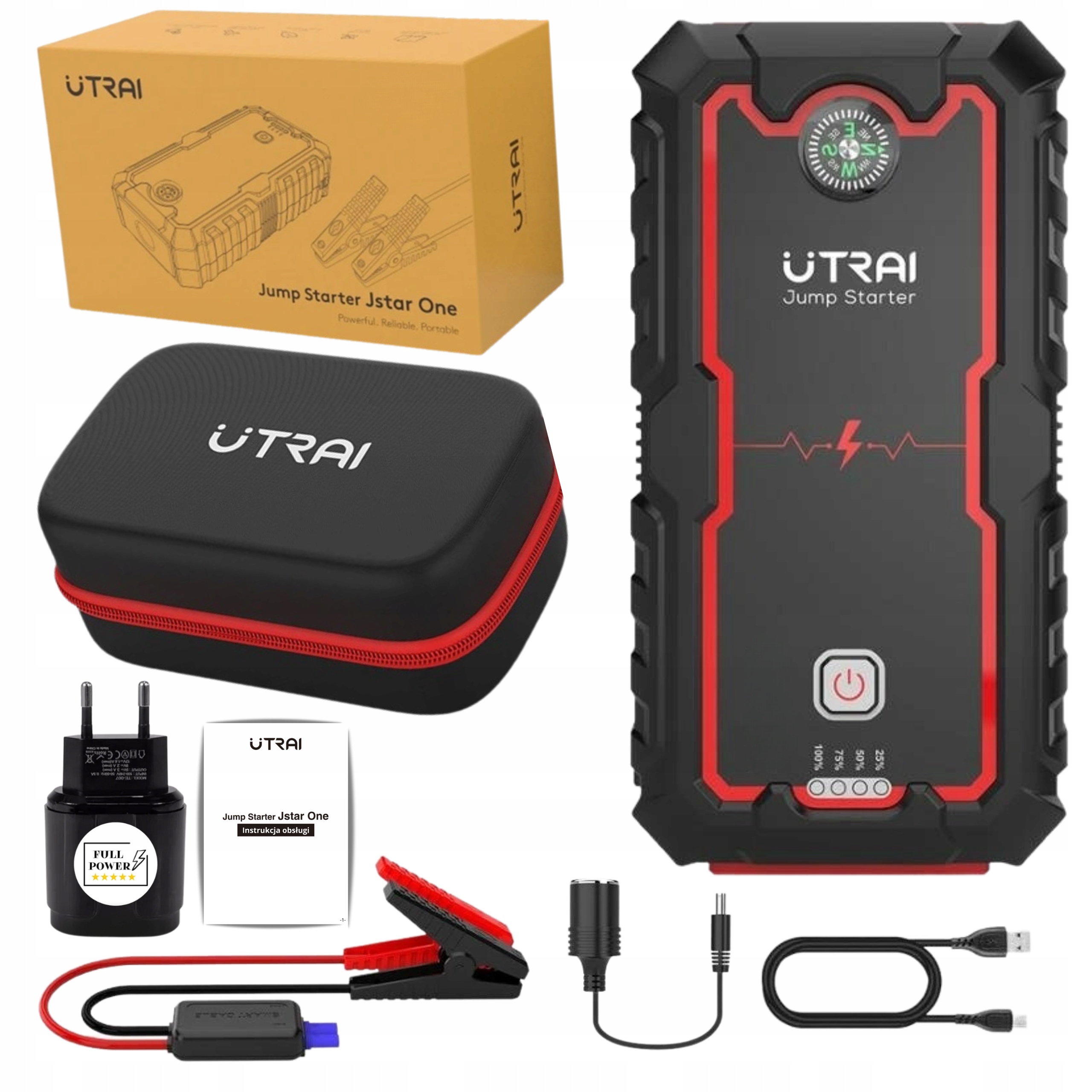 - Полный комплект : В комплект поставки входит все необходимое — кабели, кабель USB-C, инструкция на польском языке, адаптер для прикуривателя и зарядное устройство Full Power®.