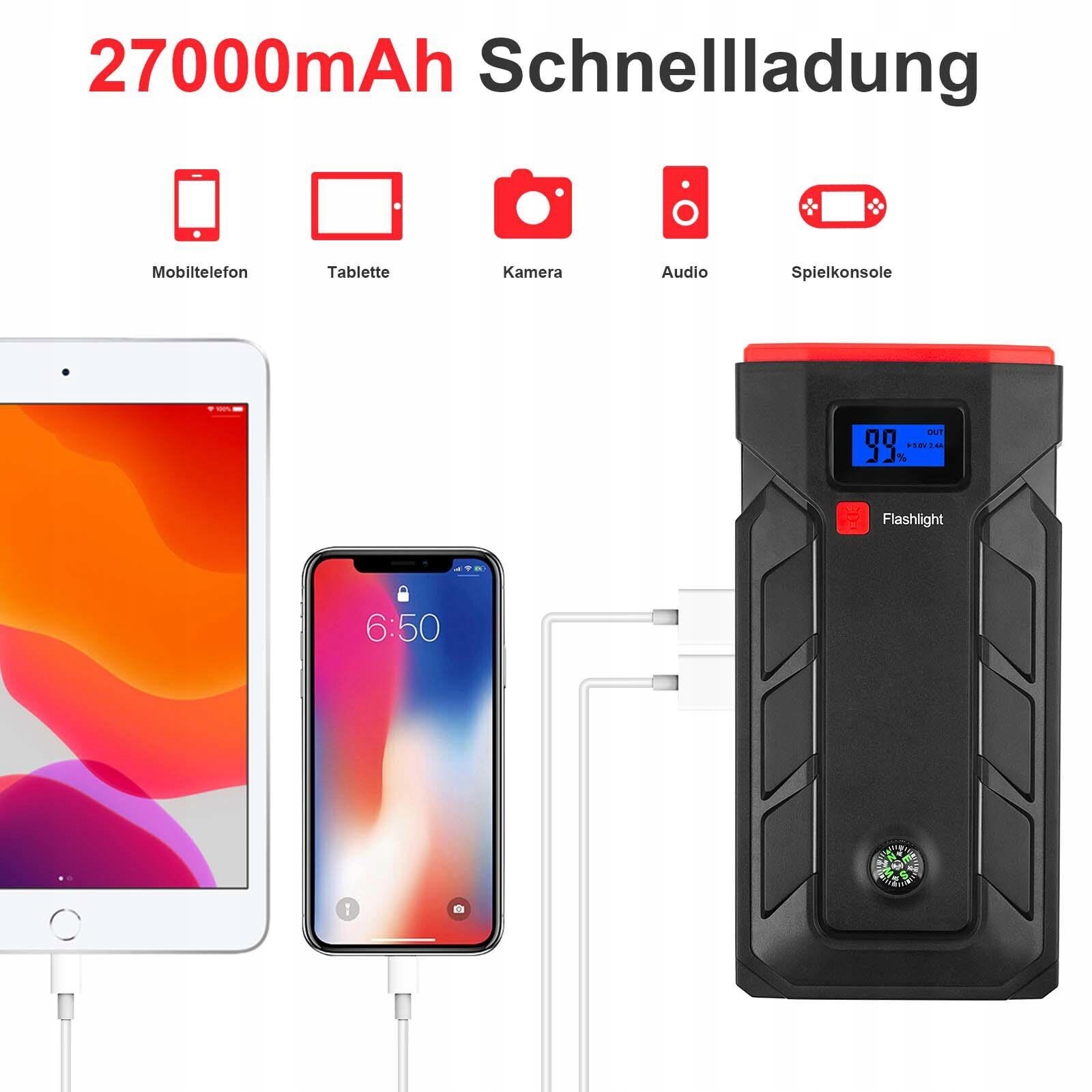Благодаря емкости 27000 мАч, пусковому току 500 А и пиковому току 1000 А он станет хорошим помощником, когда ваш автомобиль внезапно сломается или разрядится. или не запустится. Подходит для большинства бензиновых автомобилей с двигателем 12 В объемом менее 6,0 л и дизельных автомобилей с двигателем 12 В объемом менее 3,0 л.