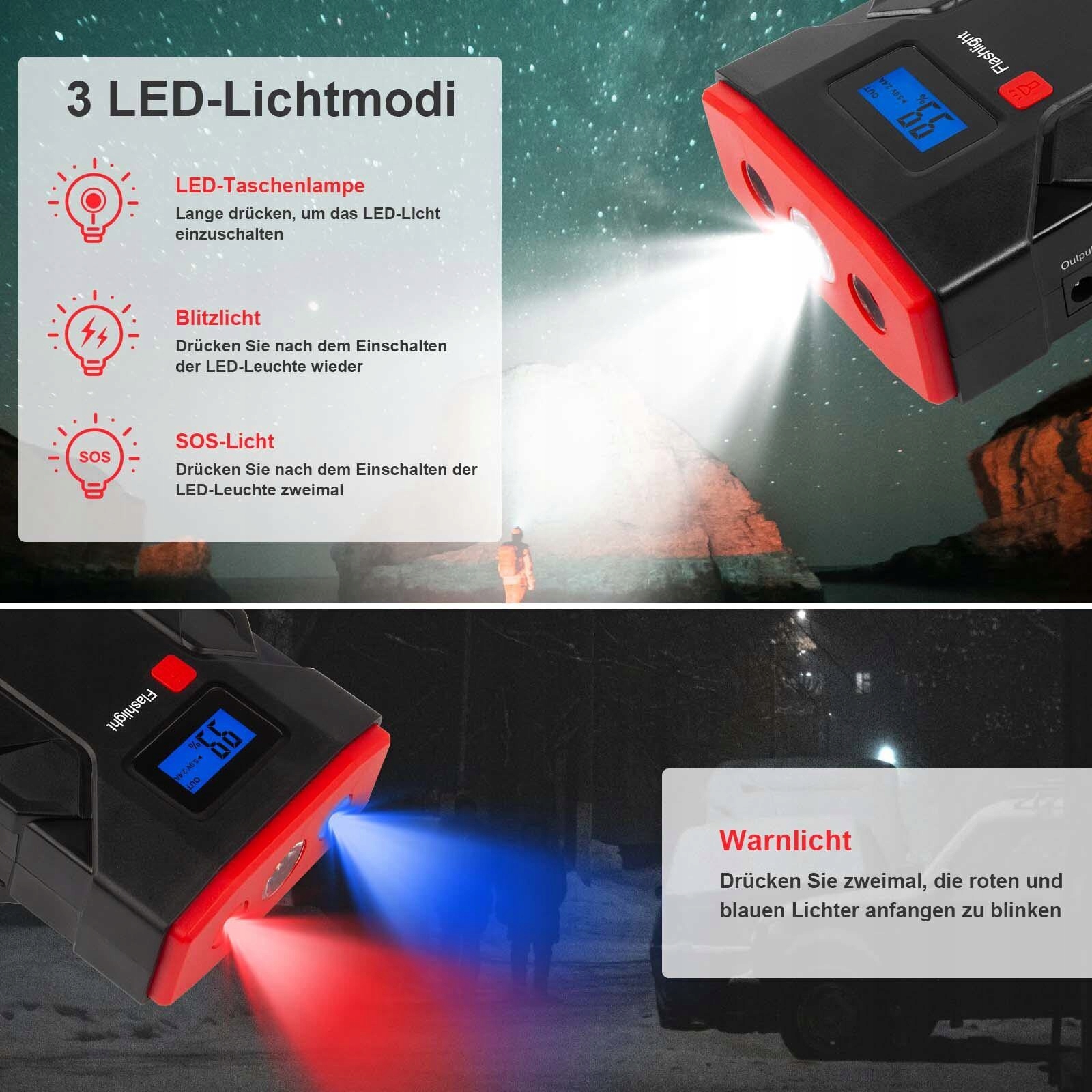 Аккумуляторный стартер имеет 3 режима светодиодного освещения: стробоскоп, стробоскоп и сигнал SOS. Этот универсальный фонарик пригодится в чрезвычайных ситуациях и при приключениях на природе.