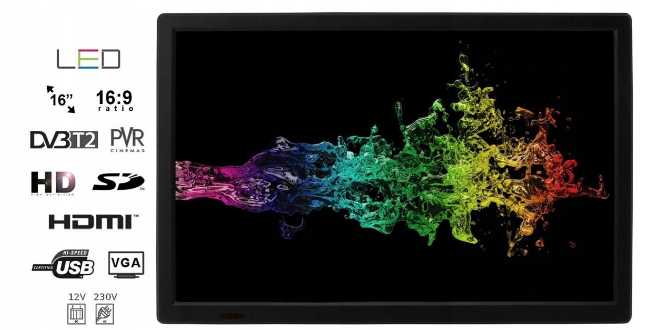 ПОРТАТИВНЫЙ ТЕЛЕВИЗОР С ЦИФРОВЫМ ТЮНЕРОМ 15,4" СВЕТОДИОДНЫЙ ЭКРАН DVB-T MPEG-4/2 DVD USB SD 12В 230В принимает новейшую систему кодирования наземного телевидения DVBT2 кодек H.265/HEVC, что делает его пригодным для приема Польское и зарубежное цифровое наземное телевидение в системе DVB-T/T2 MPEG-4/2